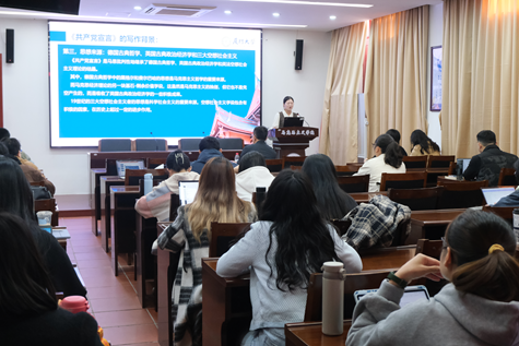 在点评总结环节,张艳涛老师总结了《共产党宣言》这一马克思主义经典文本作为中国共产党的精神来源之一和我国社会主义国家建设的基本原则的重要性,并在此基础上对马院学子提出了解放思想、实事求是、与时俱进、守正创新的要求。