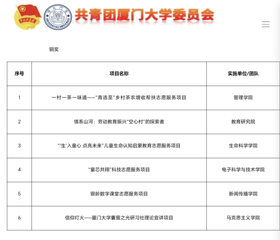 近日,由共青团厦门大学委员会、厦门大学青年志愿者行动指挥中心举办的2023-2024学年厦门大学志愿服务项目大赛获奖名单揭晓,我院“信仰灯火——囊萤之光研习社理论宣讲项目”荣获铜奖。