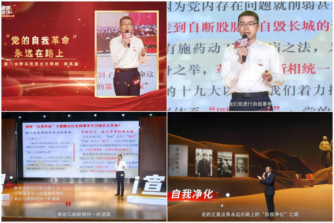 总决赛现场,陈其源作了题为“党的自我革命永远在路上”的理论宣讲。以中国化时代化马克思主义建党学说的最新成果为宣讲主线,从马克思主义基本原理的理论基础、厦门大学校主陈嘉庚得出“中国的希望在延安”的历史启迪、不同政党在革命与建设道路上的实践反思等层面展开具体论述,在“元宇宙XR技术”的加持下对宣讲命题做出了比较精准和具象化的表达,获得了专家评委与参赛选手的一致好评。