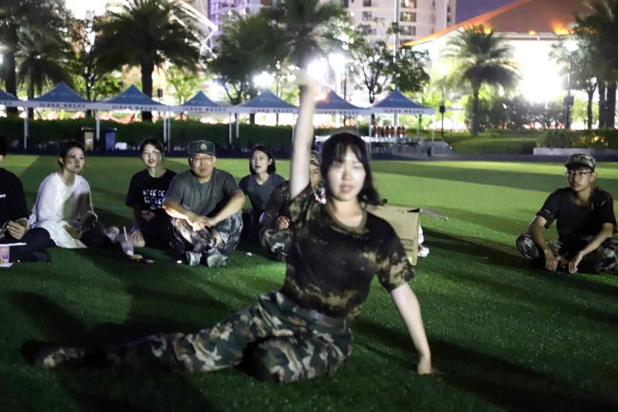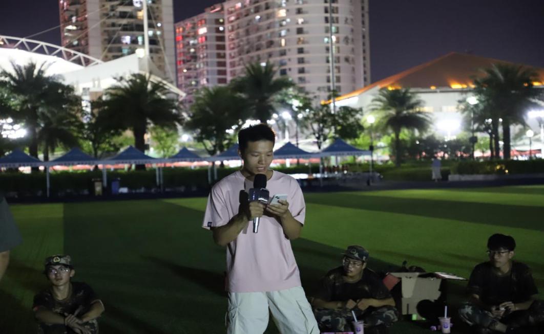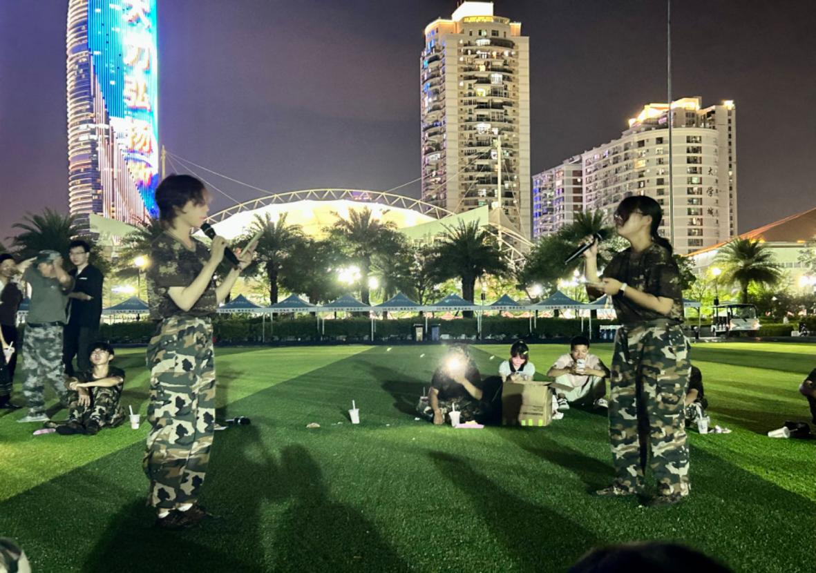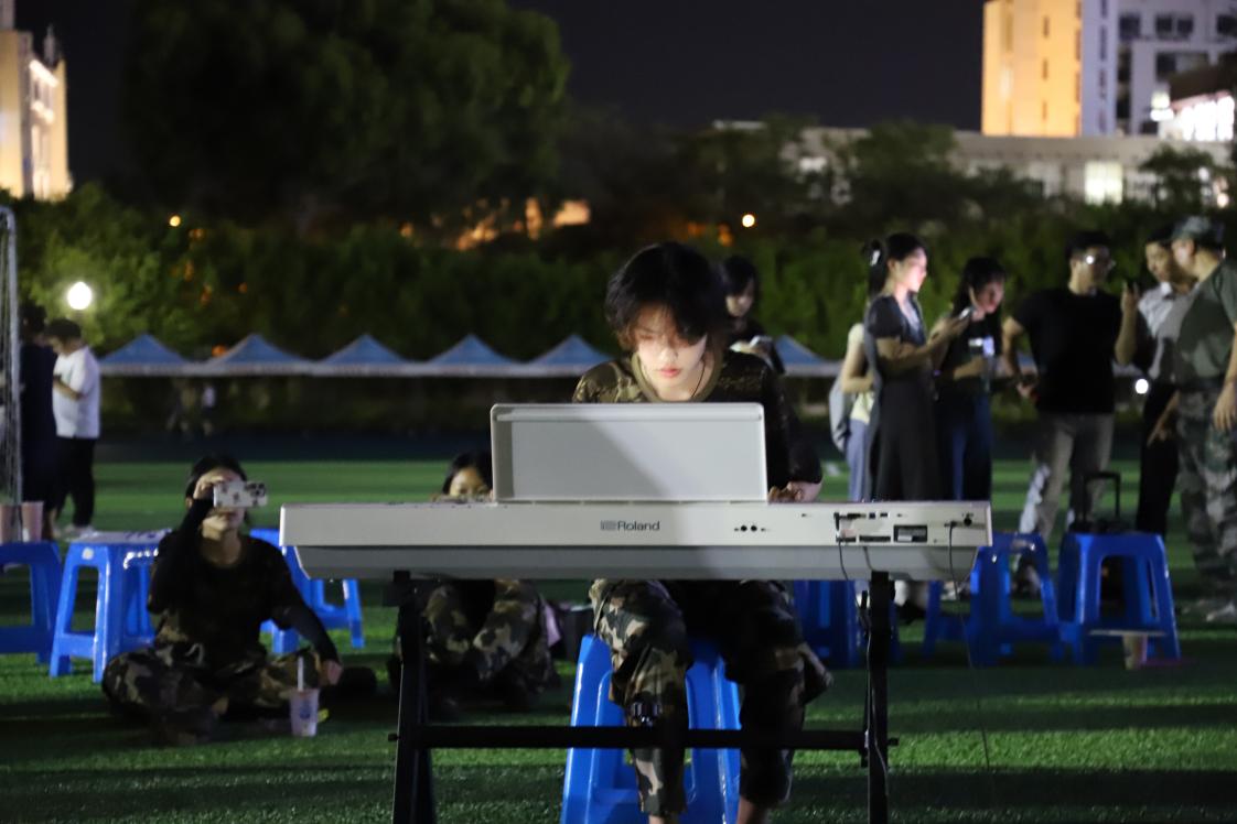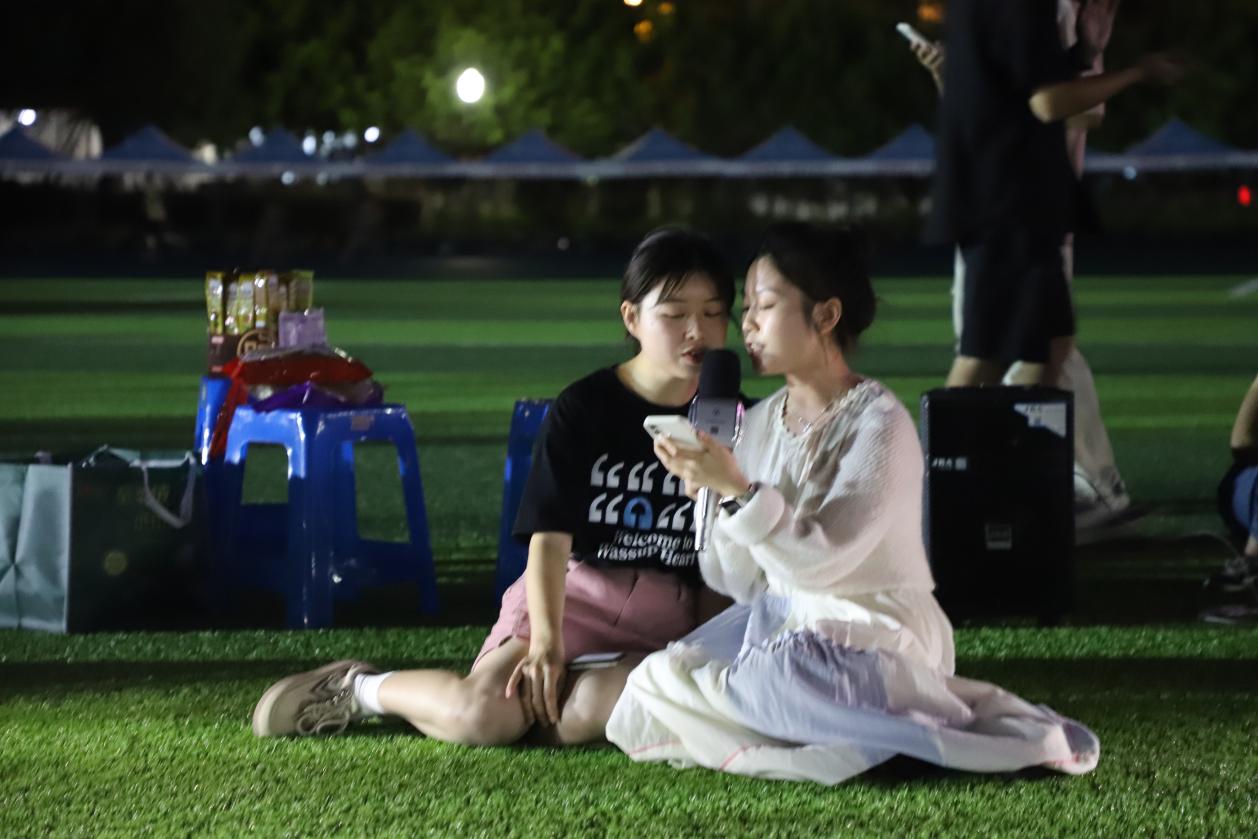 夏静和蓝心雨两位研究生学姐带来双人合唱《我要你》,优美的旋律中浸润着浪漫的气息,悠扬的歌声在演武场回荡,和晚风一起抚平大家的疲惫和燥热。