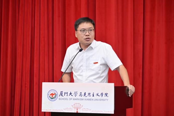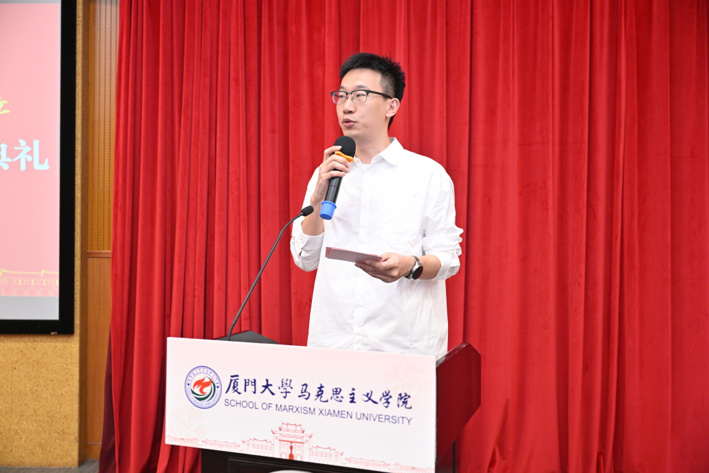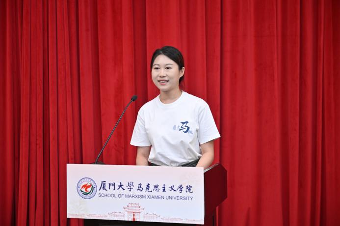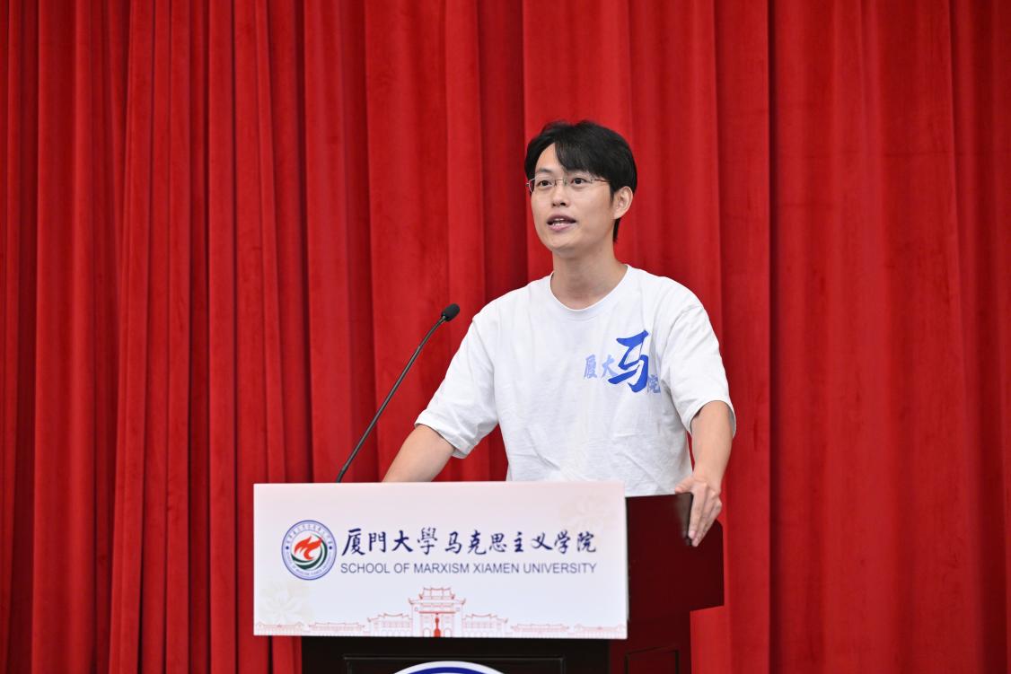 师生齐心协力,未来之志可期。佳宏伟老师作为导师代表,分享了他在厦门大学求学、任教的经历,教导同学们要沉下心来多读书,常去图书馆闻一闻书的味道,在那里找到自己的专属座位。他表示,马院的老师们是值得信赖的,他们不仅是师长,也是大家的朋友,同学们要多与学院的老师们交流,增进师生情谊,学习师之高远。同时,厦门大学是一个可以让每位学子梦想成真的地方,他鼓励同学们好好享受学校带给大家的无限可能。