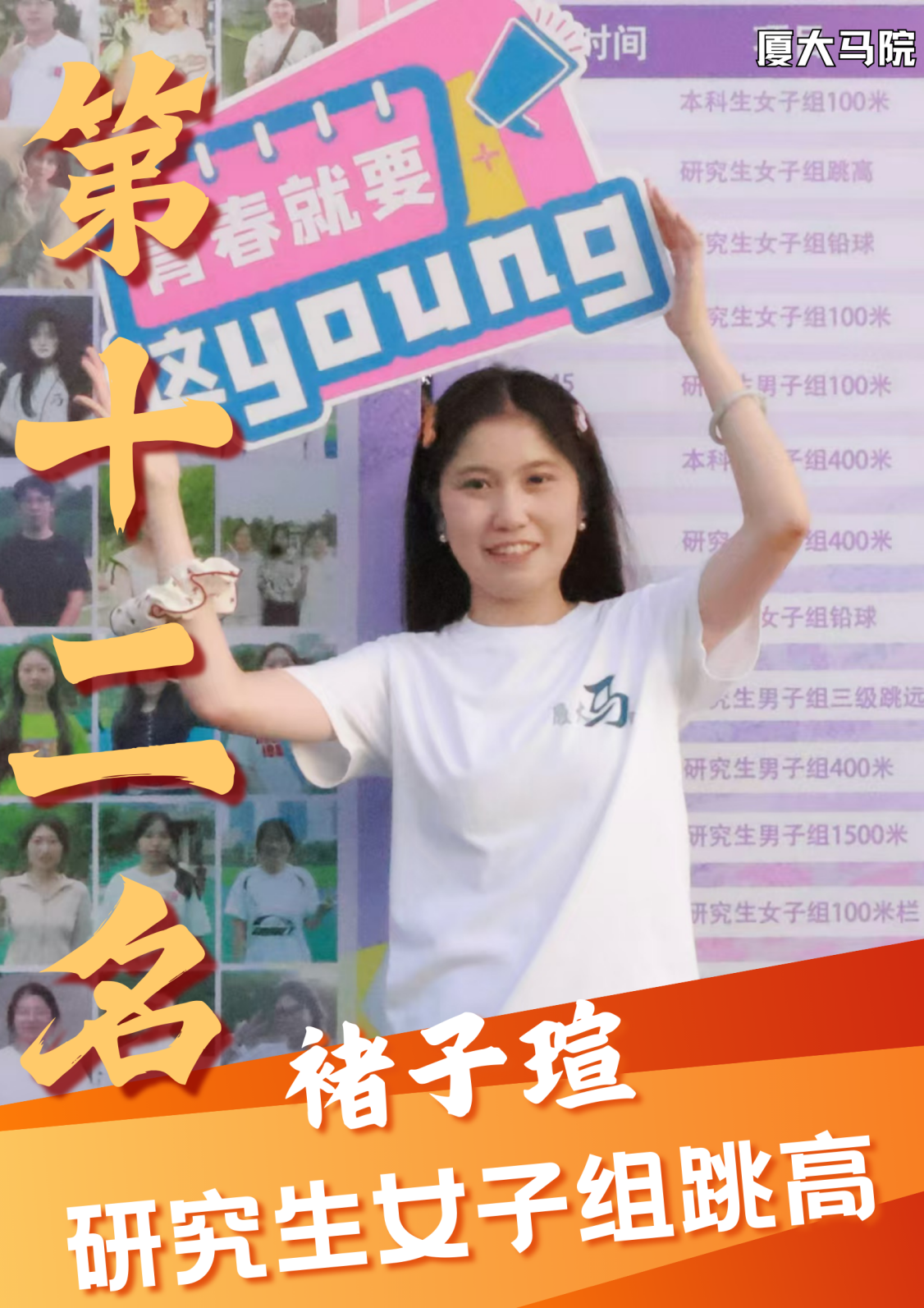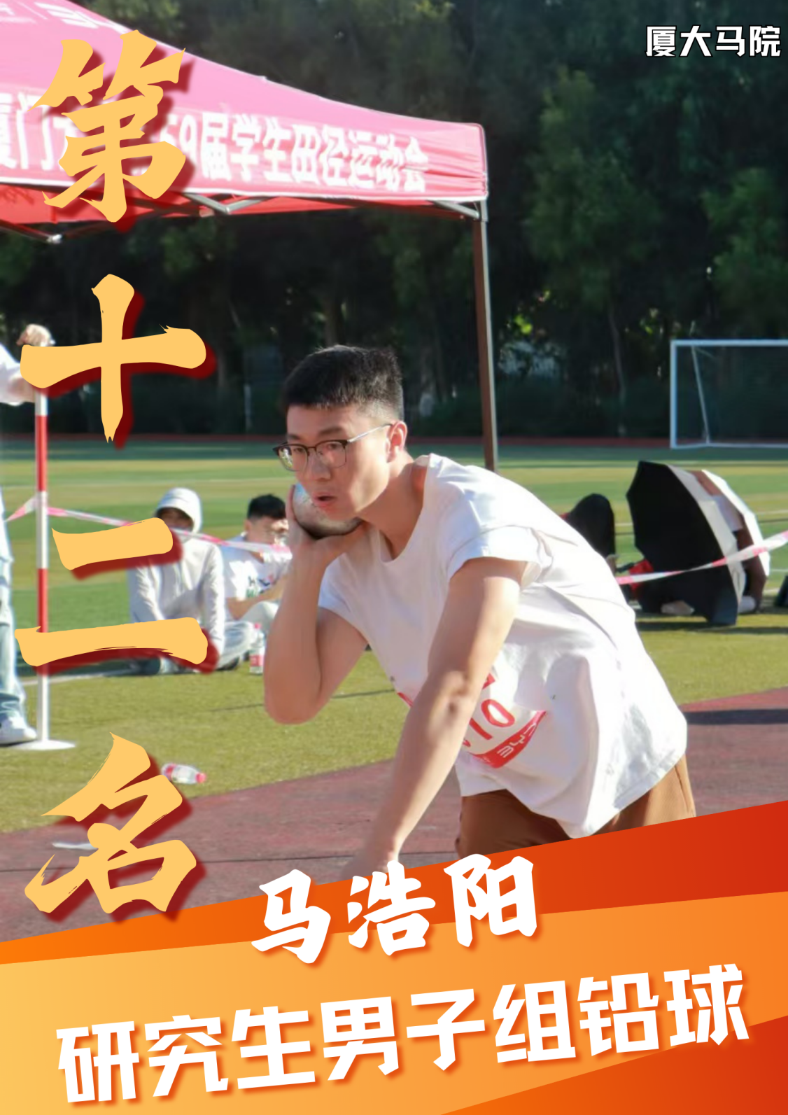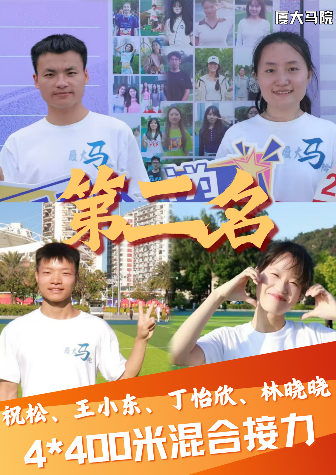 第一次以运动员的身份参加校运会,很激动能够参与这个团体项目。赛场上我们每一位同学都尽力做到了最好,非常开心取得了第七名的好成绩。同时也很感谢一直陪伴我们的志愿者,在赛场旁为我们加油的同学们,有了马院的大家庭才有了我们这一场精彩的比赛!!爱体育、爱马院、爱厦大!