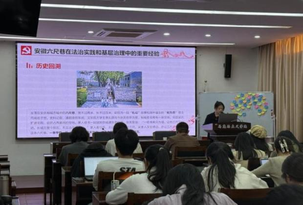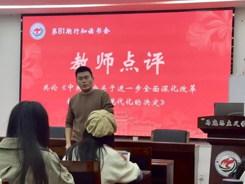 本次读书会分为小组汇报、教师点评、各抒己见和总结交流四个环节。活动伊始,第四小组的朱晓阳、郑言两位同学针对文本,以《决定》精神解读、现实问题分析探讨、思考与展望为主体内容开展了本次读书汇报。朱晓阳同学首先深入剖析了《决定》的精神实质,阐述了中国式现代化在全球视野下的深远意义,并借助思维导图直观展示了全面深化改革的必要性和迫切性,对党的领导在推动中国式现代化进程中的核心作用进行了着重强调。随后,郑言同学紧密联系社会现实,以安徽六尺巷为例,总结其在法治建设和基层治理方面的宝贵经验,并从实践层面探析了进一步全面深化改革的发展成效。两位同学的汇报内容详实、逻辑清晰,赢得了在场师生的阵阵掌声。