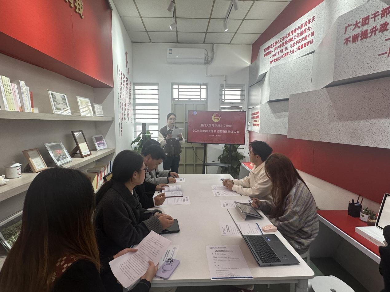 为深入学习贯彻党的二十届三中全会精神,全面贯彻落实习近平总书记关于青年工作的重要思想,进一步规范团的基层组织建设,激发基层团组织活力,提升共青团工作水平,2025年2月28日,马克思主义学院2024年度学生团支部书记现场述职评议会在思明校区芙蓉二号楼青马基地召开。马克思主义学院党委副书记刘晓峰,团委书记侯佳君,辅导员庄键安出席会议,学院团支部书记和团员代表参加会议。会议由学院第十三届团总支书记项凌主持。