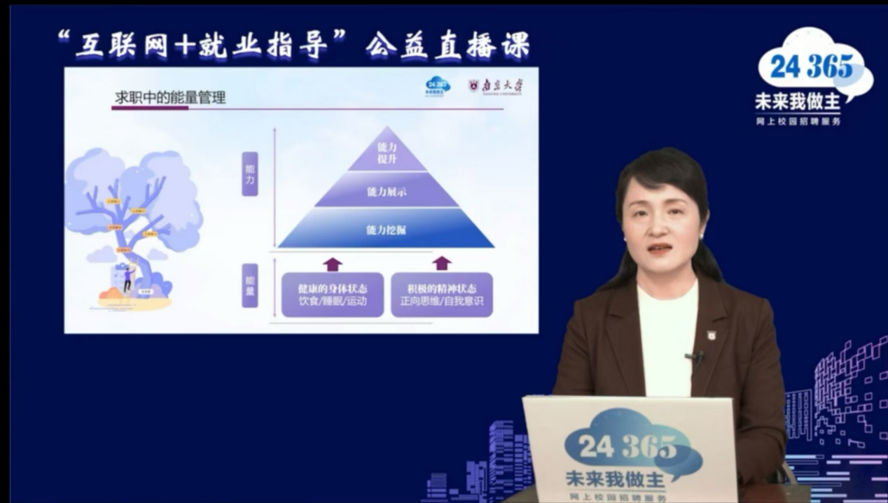 本次课程由南京大学资深生涯咨询师刘慧主讲,她围绕职业选择中的识局、明志、谋略、正念等生涯智慧展开详细讲解,结合“求职能量层级评估”“求职中的能量管理”“求职计划与方案”等模块,系统解析职场应对策略。授课过程中,刘慧老师通过“大学生求职能量层级评估”引导学生从“主动应对”到“悲观逃避”六个层级中定位自身状态,并强调能力提升、健康管理和正向思维在求职中的关键作用。