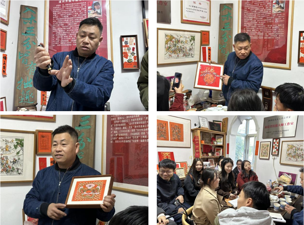 走进漳州木版年画省级传承人颜朝俊工作室,实践队员的目光立刻便被墙上悬挂的《狮衔剑》《神荼郁垒》等精美年画吸引。颜老师手抚刻刀,边展示作品边讲解工艺奥秘——从梨木刻版的精雕细琢,到矿物颜料套色的层叠晕染,一幅年画的诞生少则数月、多则经年。刀锋游走间的微妙力道,彩墨交融时的浓淡把控,无不凝结着匠人数十载淬炼的智慧结晶。
