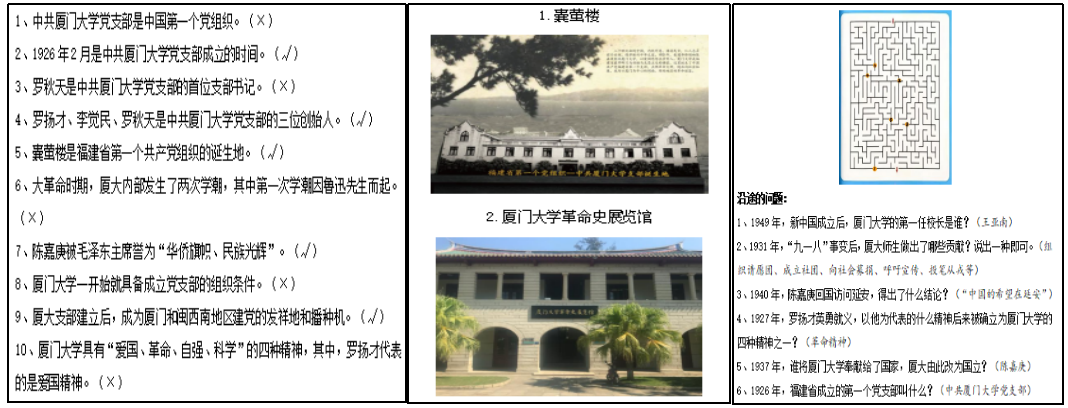 “速答厦大革命史知识”通过设置判断题的形式,辅以志愿者的知识讲解,加深了参与者对厦大革命史的了解;“再绘厦大革命史场景”选取了厦门大学囊萤楼、革命史展览馆、中共厦门大学党支部成立等厦大革命史上标志性的地点与事件作为拼图素材,重现历史场景;“重走厦大革命史路线”将题目融入复杂的迷宫游戏中,不仅考验了参与者的细心与耐心,还让大家在游戏过程中重温厦大革命史记忆,赓续红色血脉。