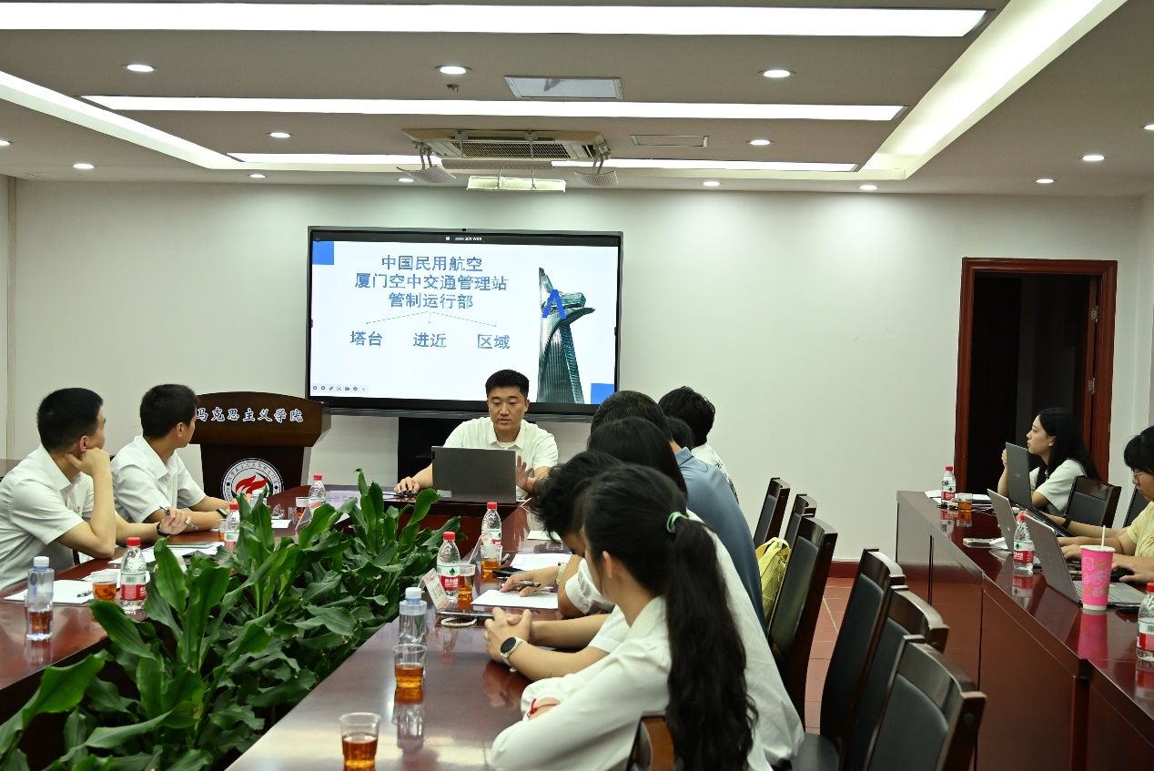 厦门空管站管制运行部团总支书记胡忠博则围绕空管知识展开分享交流,详细讲解了空管行业的发展脉络、保障航班安全的前沿技术手段以及无人机飞行审批流程等专业内容,并借助视频资料生动展示了塔台管制员的日常工作场景。