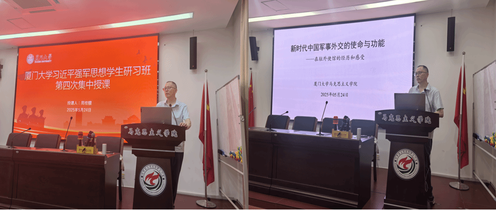 5月24日上午,厦门大学习近平强军思想学生研习班第四次集中授课在马克思主义学院囊萤楼216会议室举行。厦门大学国际关系学院/南洋研究院讲座教授周桂银应邀作“当代中国军事外交的使命与功能”的专题讲座。马克思主义学院团委书记侯佳君主持。