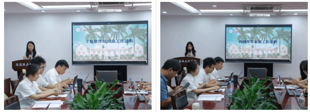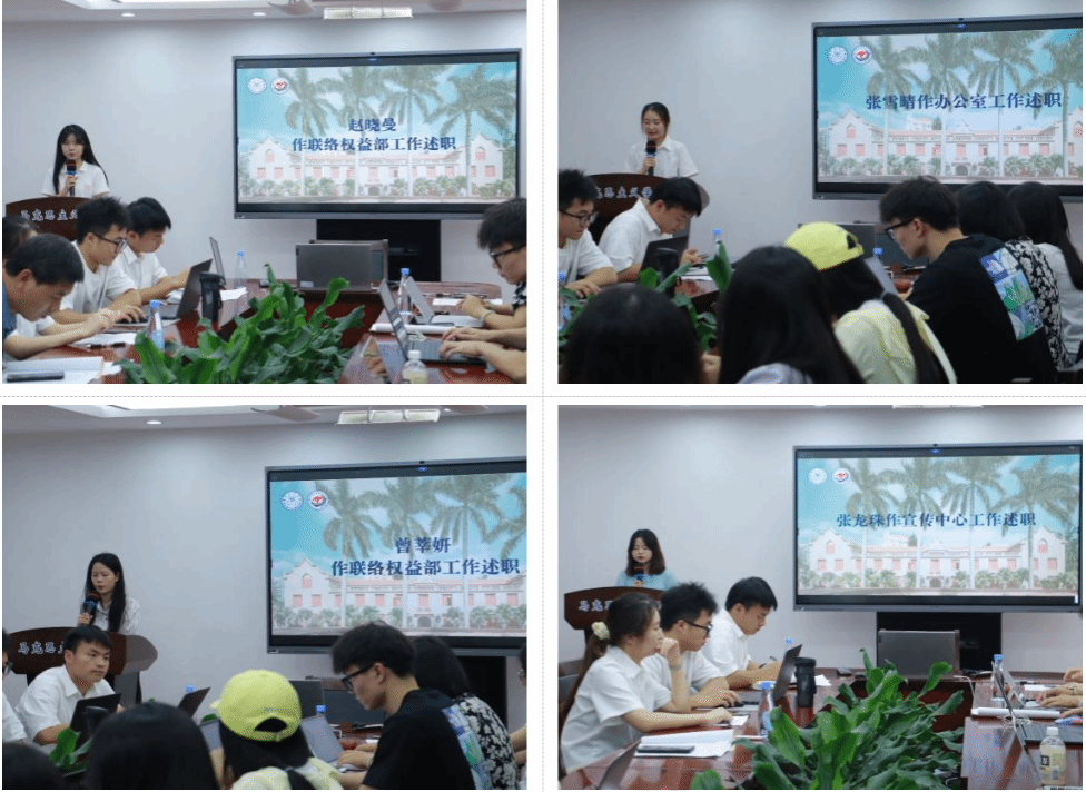 随后,各部门负责人依次展开述职。组织部负责人丁怡欣指出本学期行知读书会依托校际联动、跨专业研讨两大形式创新,为广大学子提供了一个更加优质、开放的学术交流平台;发展部负责人尚瑾总结梳理了师生趣味运动会、毕业典礼、文创产品设计等重点工作成果,并着重展示了过去一年学院学子在各类校级文体活动中取得的突出成绩;联络权益部负责人曾莘妍与赵晓曼以亲师问道党建沙龙、端午节手作活动为例,阐述了本学期志愿服务品牌建设与校园权益活动开展的工作情况,并表示将继续推进革命史馆标准化运营,强化校内外红色教育联动;办公室负责人张雪晴围绕经费报销、骨干培训、囊萤楼225会议室管理等工作进行总结,强调要进一步通过系统性培训提升组织运行效能;宣传中心负责人张龙珠汇报了活动摄影、视频制作、海报设计等工作成果,针对新闻时效性问题提出了加强宣传技能培训的改进方案。