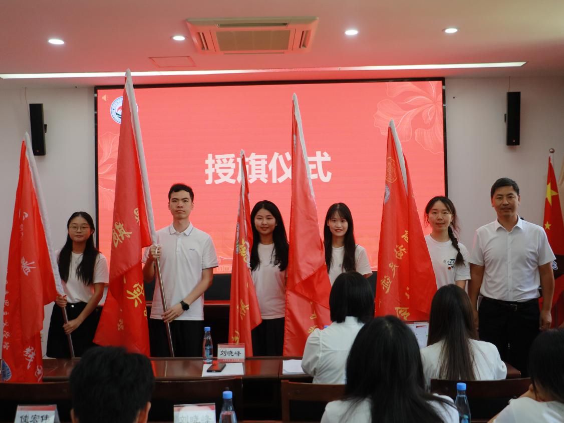 随后,刘晓峰为学院5支校级重点立项队伍代表授旗,并指出暑期社会实践在学生成长成才中的重要意义,勉励大家以严谨态度、饱满热情投身实践。同时,他强调要牢固树立安全意识,严格遵守实践纪律,确保实践活动安全有序开展。