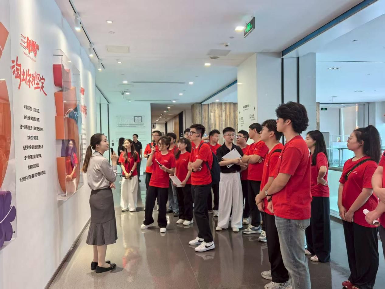 聚焦教育科技人才一体化背景下高新技术企业人才效能提升机制研究这一课题,实践队深入阿里巴巴集团控股有限公司开展专题调研。作为一家始终致力于探索和创新的科技公司,阿里巴巴构建了多层次、多维度的人才培养体系,涵盖从入职培训到高管培养的全过程;建立了多元化的创新激励机制,鼓励员工在工作中不断探索和创新。在“一年香、三年醇、五年陈”的企业文化墙前,实践队员深刻体悟到人才培养与创新驱动的深度融合,进一步认识到人才是推动经济社会发展的“第一资源”,是实现产业升级和创新发展的关键因素。