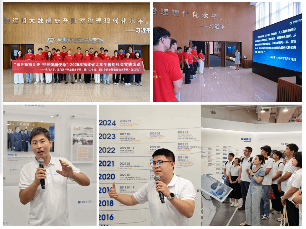 “要运用大数据提高国家治理现代化水平。”实践队追寻习近平总书记的足迹,走进杭州城市大脑运营指挥中心和杭州城市大脑有限公司,聚焦科技成果赋能城市治理现代化开展专题学习调研。在“数字城市技术展厅”,师生深入考察“城市大脑”“一网统管”“未来社区”“智慧康养”等标杆案例,深入了解覆盖公共服务、志愿服务、家政服务等多领域的惠民数字化场景,真切感受到大数据等前沿技术在提升城市治理精细化、智能化方面的巨大价值与广阔前景。厦门大学思政课教师陈仁锋的微课指出,智慧治理的底色是“人民至上”,运用先进技术不断满足人民对美好生活的向往,是中国共产党“全心全意为人民服务”根本宗旨的生动实践。“看到‘城市大脑’如何精准解决百姓的急难愁盼,我理解了科技创新的终极目标是让人民群众过上美好生活。”厦门华天涉外职业技术学院机械设备智能制造专业的王嘉鑫同学感慨道。