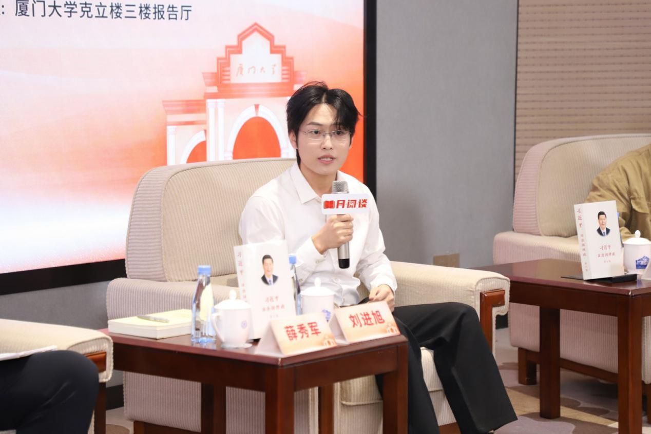 学习沙龙中,我院2023级博士研究生刘进旭作为青年学子代表,分享了对党的创新理论体系化、学理化研究阐释的理解。他说,伟大思想需经过实践到理论、个别论断到系统集成的过程,党的创新理论也需体系化梳理与学理化升华,以严谨逻辑指导社会主义现代化。作为青年马克思主义学者,他表示将进一步发挥主观能动性,提升理论素养和本领。一方面,立足厦门特区实践深挖理论富矿,通过深入研究厦门的实践案例,为理论的体系化、学理化阐释提供生动的注脚;另一方面,要弘扬特区精神,依托高校平台,探索学术前沿、参与重大课题,争当理论研究“先行者”“传播者”,为推动党的创新理论“飞入寻常百姓家”贡献青春力量。