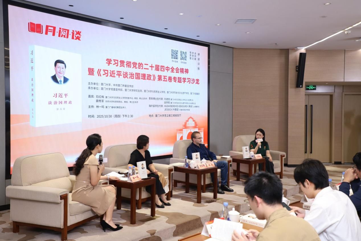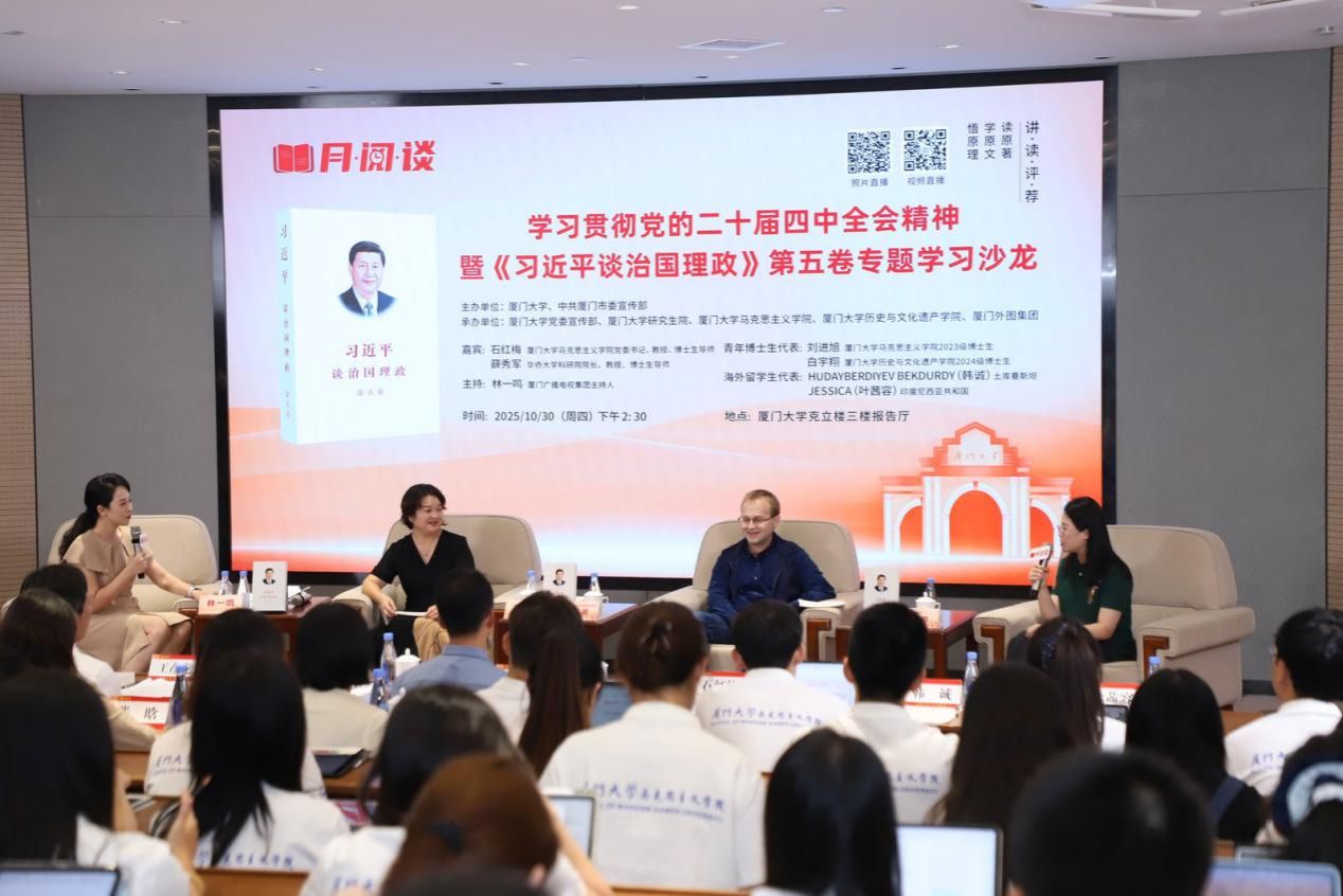 为深入学习贯彻党的二十届四中全会精神,推动《习近平谈治国理政》第五卷入脑入心,10月30日,由马克思主义学院联合承办的第50场“月·阅·谈”学习明理活动在厦门大学克立楼报告厅开展。