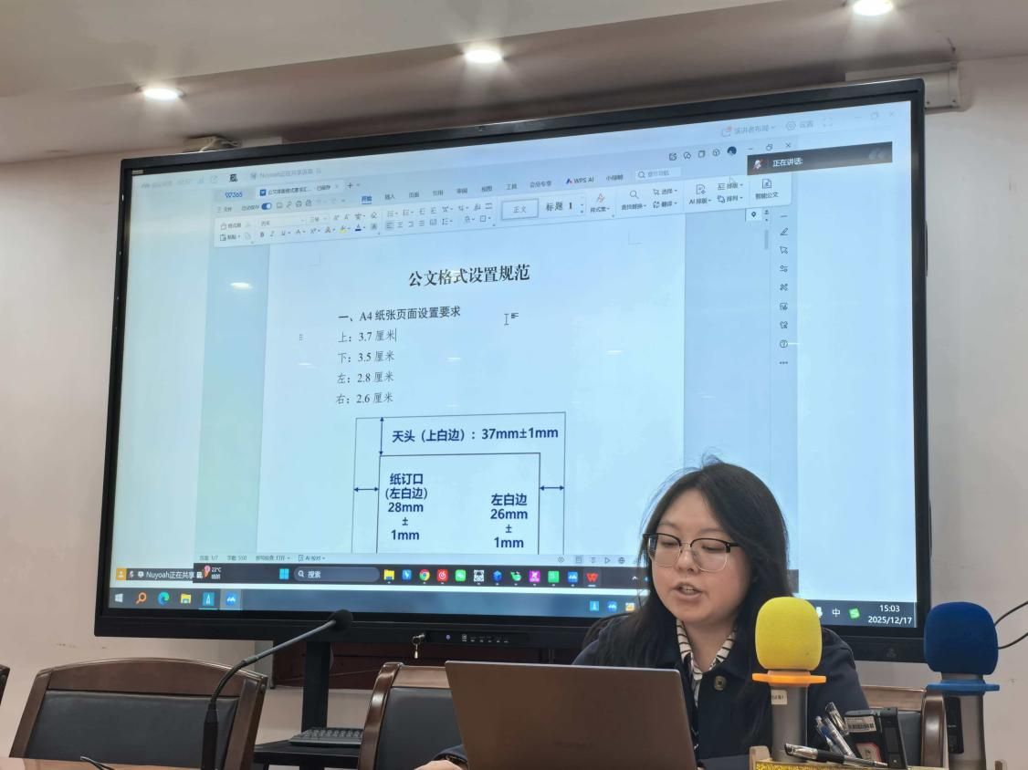 培训中,熊秋婷结合自身学生工作与文稿处理经验,系统讲解了公文排版的基本规范、常见误区与实用技巧。她指出,规范的公文排版不仅是工作严谨性的体现,也是个人专业素养的重要组成。她以常用的通知、新闻稿等为例,通过现场操作演示,详细讲解了页面设置、字体字号、段落间距、标题层级等格式要素的标准要求,并针对官方网站与微信公众号等不同平台的排版特点进行了对比说明,强调公文应当做到“形式规范与内容精准相统一”。