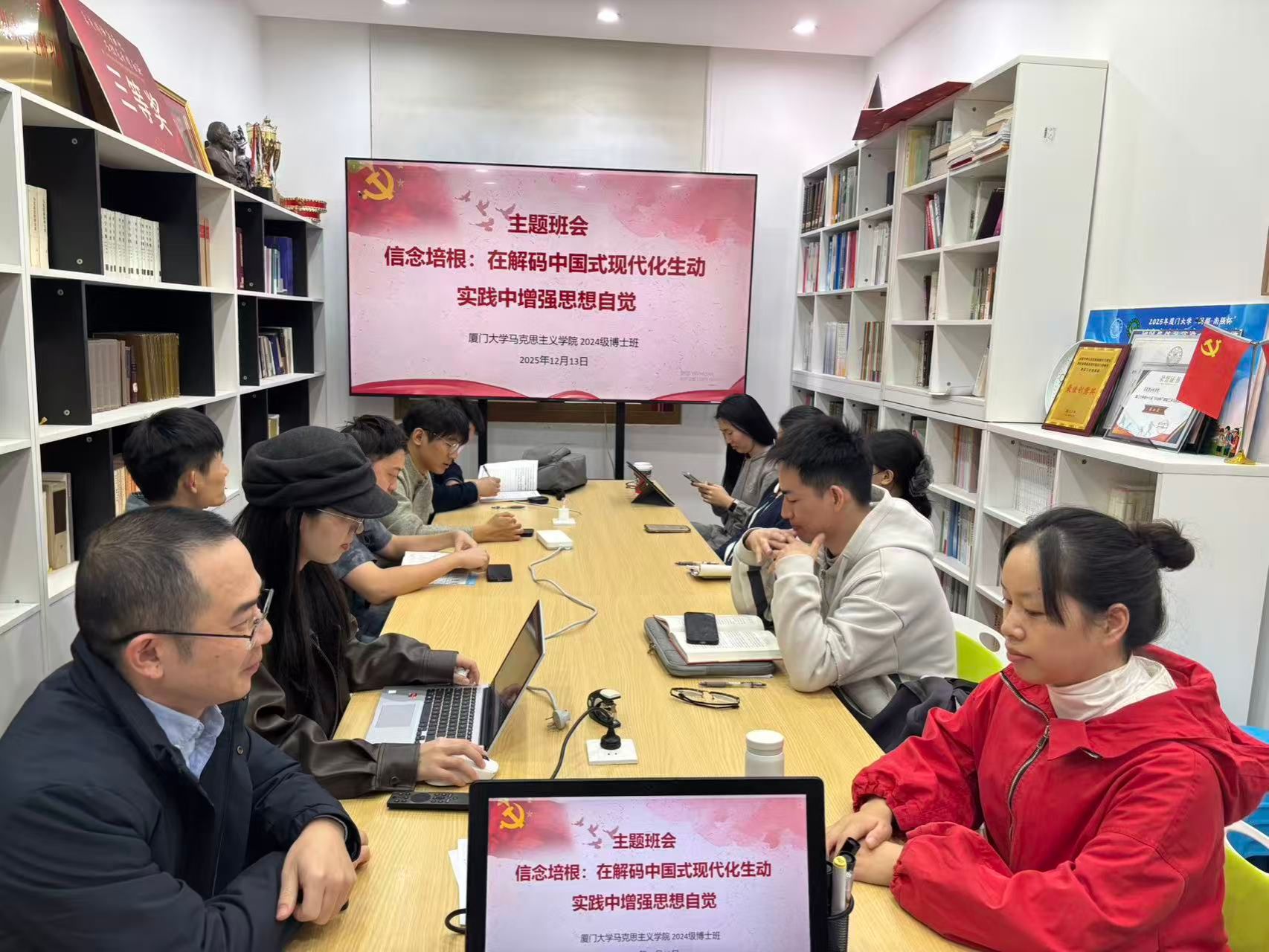 2025年12月13日下午3点,马克思主义学院2024级博士研究生班在囊萤楼225研讨室召开“信念培根:在解码中国式现代化生动实践中增强思想自觉”主题班会。班会紧扣全国高校“立报国强国大志向 做挺膺担当奋斗者”的宣传教育要求,结合博士研究生学术研究特质,通过理论阐释、实践分享与深度研讨,推动同学们从学理与现实双重维度深化对中国式现代化的认知,凝聚青春报国的思想共识。