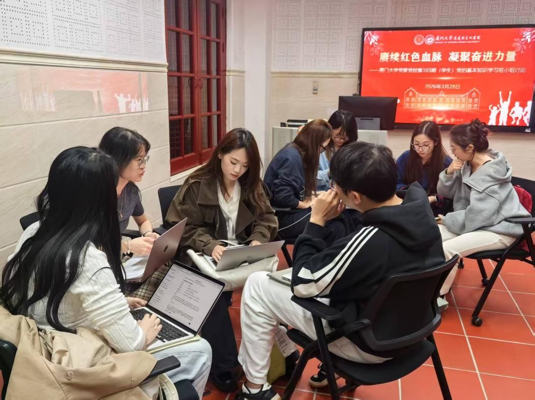 3月28日晚,在囊萤楼一楼,厦门大学党委党校第103期(学生)党的基本知识学习班的小组讨论正在轰轰烈烈展开,学院19名发展对象聚焦“如何赓续红色血脉、践行初心使命”展开讨论。大家一致认为,应以校内红色资源为基础,将党的理论学深悟透;以实习实践平台为载体,让红色基因融入日常;用实干赓续囊萤之光,将青年担当落到实处。