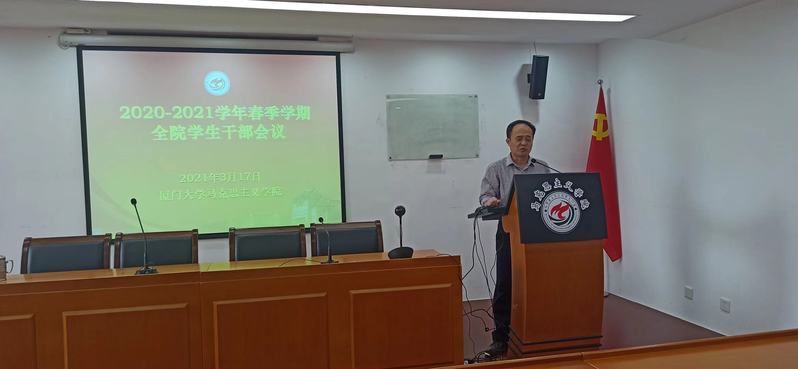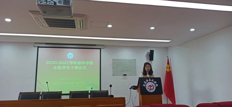 会上,杨建中副书记强调,2021年是中国共产党成立一百周年,也是厦门大学建校一百周年,广大学生要积极参与政治学习,不断提高政治站位,开展党史学习教育与校史教育。全体学生特别是学生干部要积极参与百年校庆相关活动,在不同岗位上贡献青春力量。杨老师勉励广大学生干部在学习、学生工作以及学院各类活动中发挥先锋模范作用,以蓬勃朝气迎接建党百年和建校百年。
