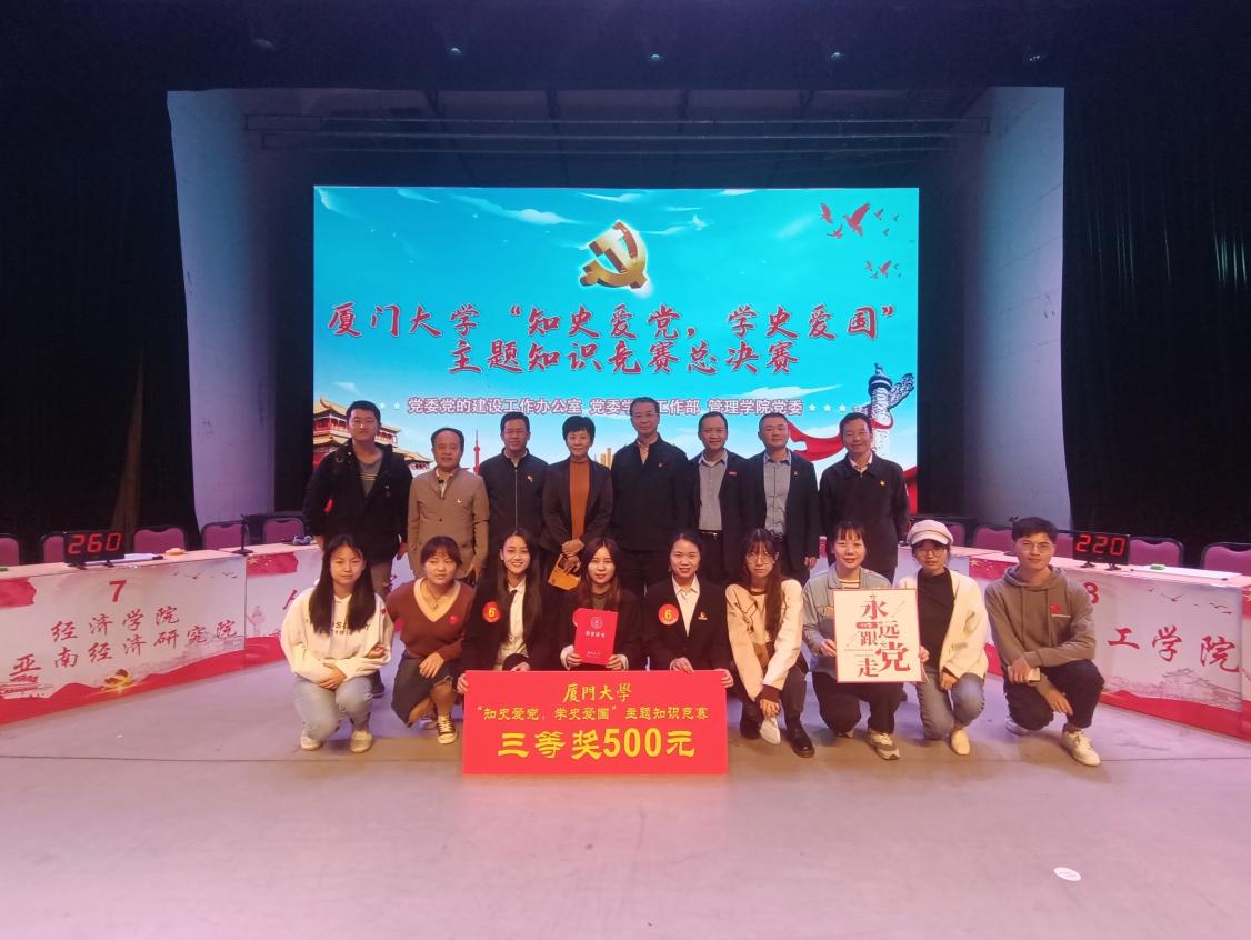 12月4日晚,厦门大学“知史爱党,学史爱国”主题知识竞赛总决赛在建南大会堂隆重举行。经过初赛、复赛层层筛选,由硕士生王丰涵,李萍,段晋美三位同学组成的“囊萤星光”队代表马克思主义学院征战决赛。