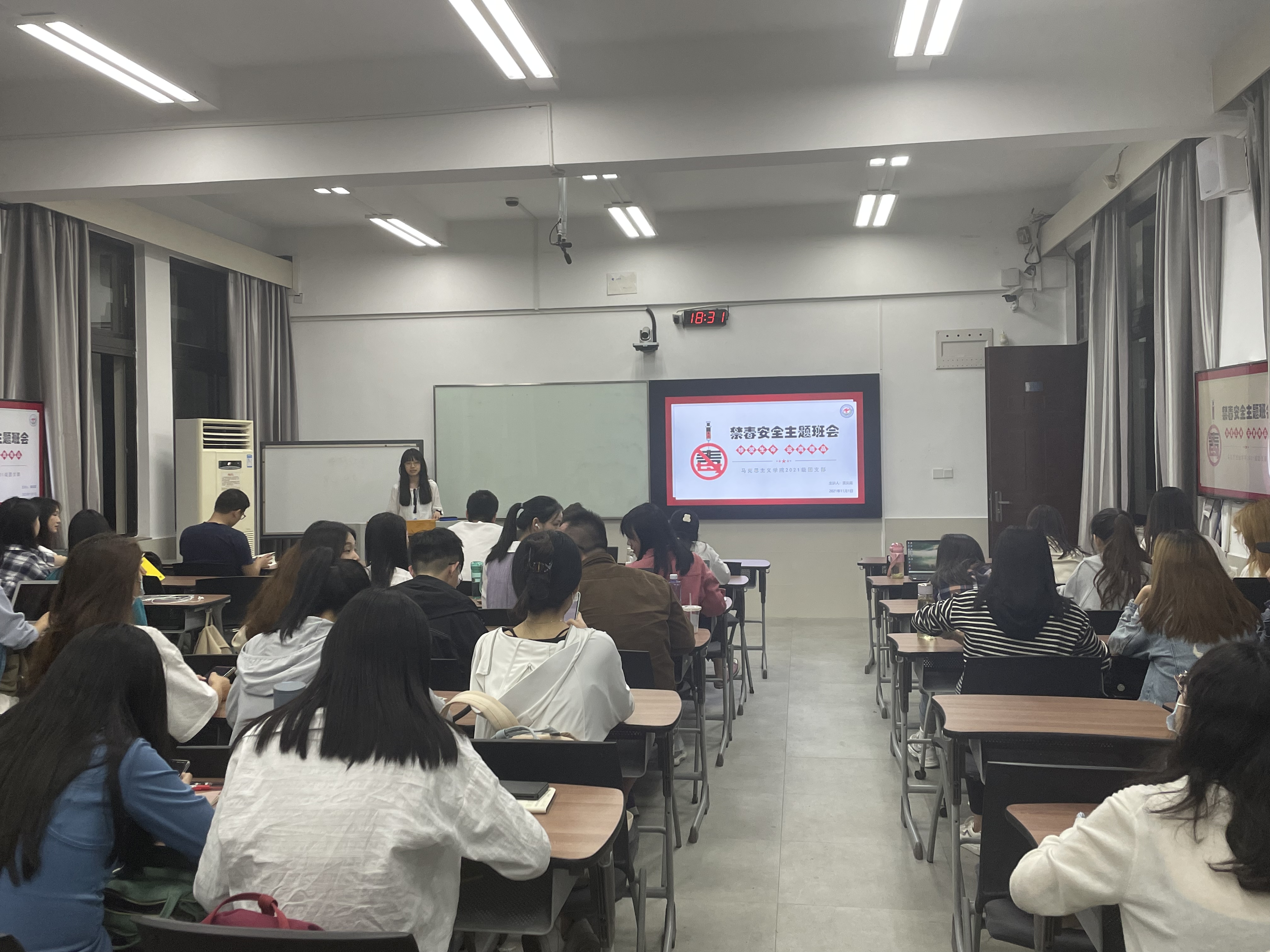 11月1日晚,厦门大学马克思主义学院2021级硕士研究生在南强二303教室举办了禁毒安全主题团课,班级团支书黄吴葳同学主持。