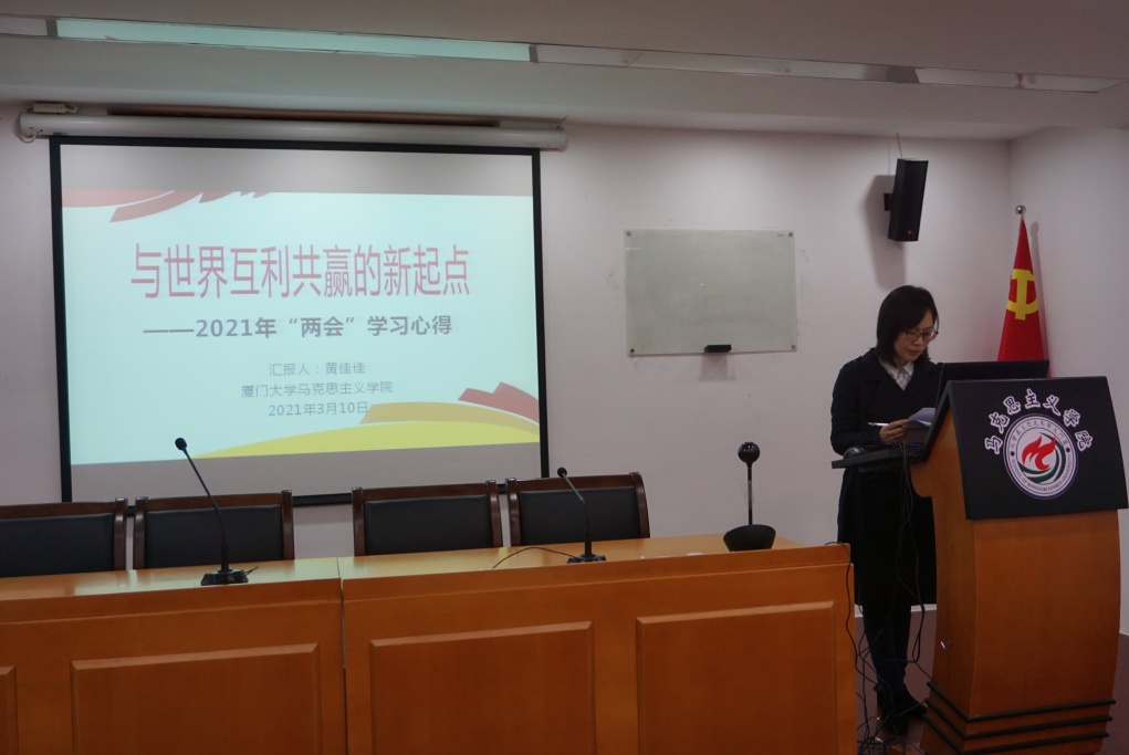 黄佳佳以“与世界互利共赢的新起点”为题,对于两会内容进行了系统梳理和回顾,并围绕“人民健康”这一热点分享亲身体悟。结合过去一年在菲律宾的工作经历,介绍了菲律宾封城防疫措施、菲律宾疫情数据以及疫情期间中菲往来情况。她认为,两会所提出的人民健康等一系列令世界瞩目的中国方案,彰显了以人民为中心的发展思想,充分体现了中国共产党为中国人民谋幸福、为中华民族谋复兴的初心和使命。