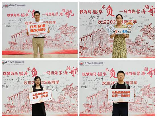 迎新当天,厦门大学马克思主义学院党委书记石红梅、副书记杨建中、团委书记郭晓玲、班主任傅志伟、党务秘书江春萍、教学秘书熊欢先后来到报到现场,详细了解迎新工作开展情况,慰问参与迎新工作的志愿者。老师们与新生们亲切交流,嘱咐新生们尽快适应校园生活,以新风貌、新气象开启新征程。此外,宣传部结合学院特色和自身学科发展,为新生们安排了入学第一拍。在迎新展板前,新生们满怀激动与期待,留下了自己踏入厦园的第一拍。“一、二、三,马院欢迎你!”镜头下,师生们的笑容分外灿烂。