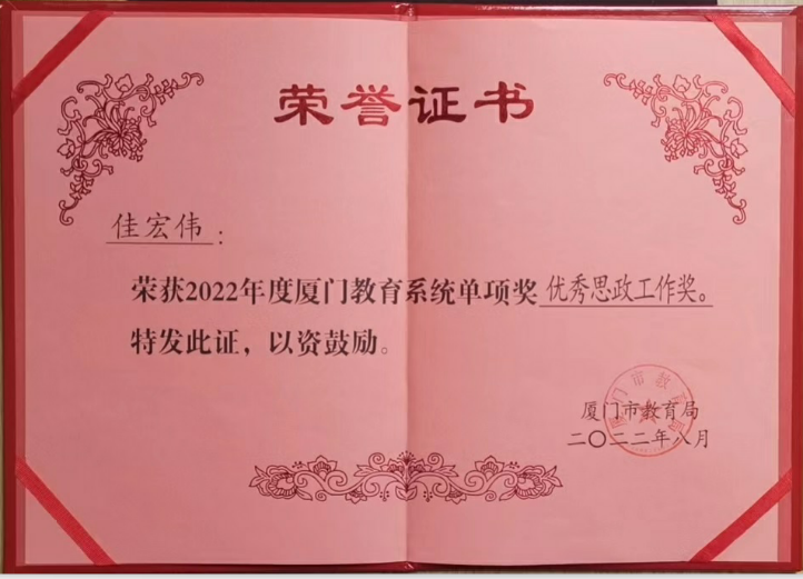 在庆祝第38个教师节之际,为表扬先进,树立典型,提振精气神,进一步激发全市广大教师工作的积极性、主动性和创造性,厦门市评选出2022年教育系统单项奖表彰人选。我院中国近现代史教研部佳宏伟副教授获评厦门市优秀思政工作奖。据悉,本次受表彰厦门市优秀思政工作奖包括大中小学教师总计30名。