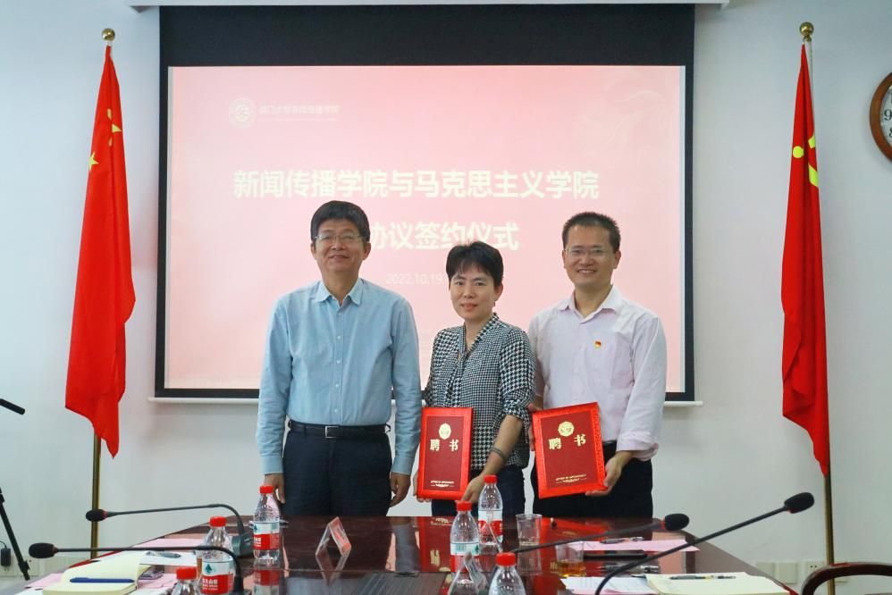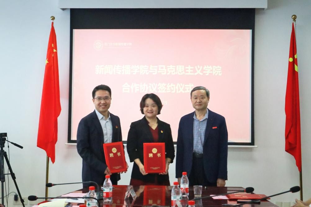 校党委副书记、马克思主义学院院长徐进功教授,马克思主义学院党委书记石红梅教授、常务副院长张有奎教授、副书记杨建中、副院长原宗丽教授、马克思主义基本原理教研部主任林密教授,新闻传播学院院长余清楚教授、副书记黄辉、李芬芬、副院长谢清果教授、新闻学系吴琳琳教授,两院办公室和团委干部参加仪式。签约仪式由新闻传播学院党委书记曾铮主持。