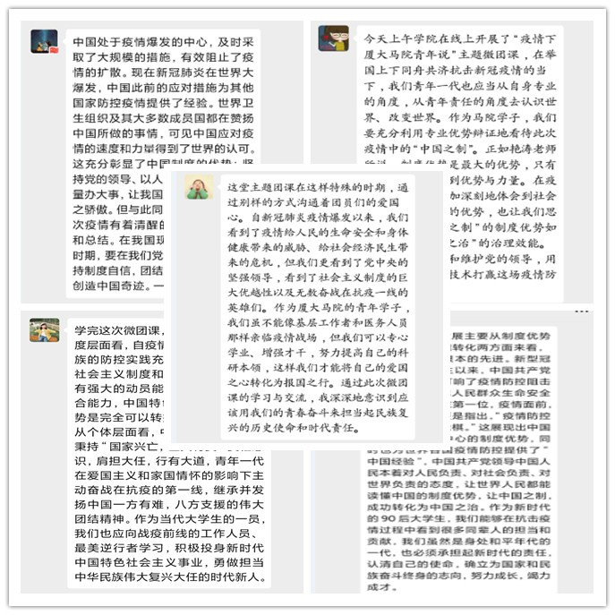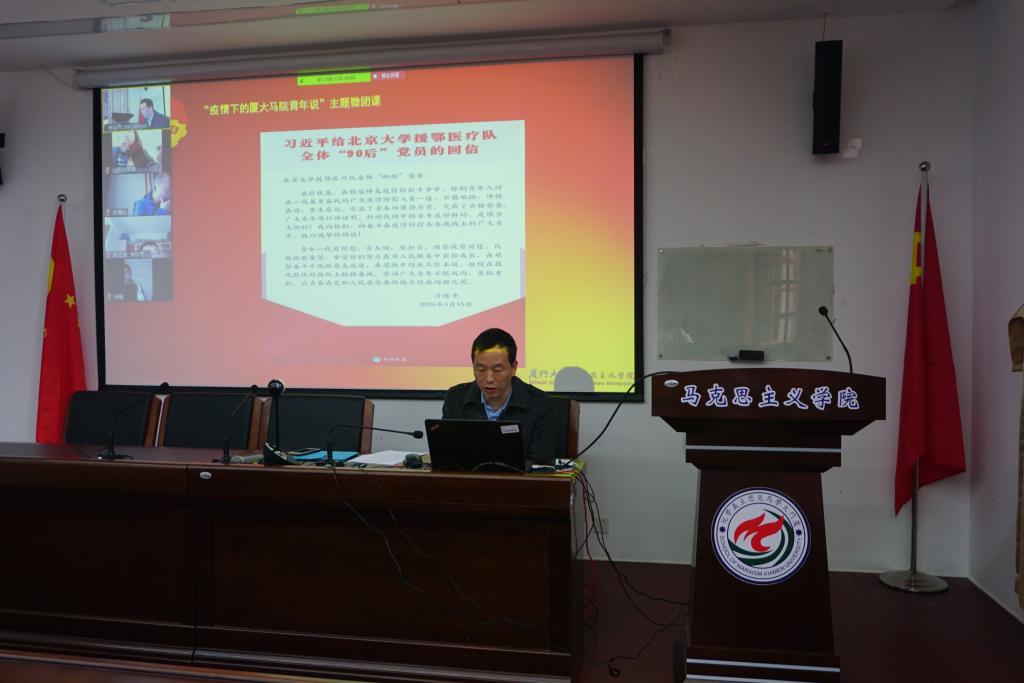 为深入贯彻落实习近平总书记关于做好防控新冠肺炎疫情工作的重要讲话精神,在坚决打赢疫情防控阻击战的关键时期,进一步做好青年团员的思想引领工作,3月18日上午,马克思主义学院团委线上开展了“疫情下的厦大马院青年说”主题微团课,团课由学院副院长、博士导师张艳涛教授主讲。校团委洪海松副书记、院党委原宗丽副书记以及学院2018级研究生团支部、2019级研究生团支部和学院其他青年学子参加了本次团课。微团课由院团委书记蔡虎堂主持。