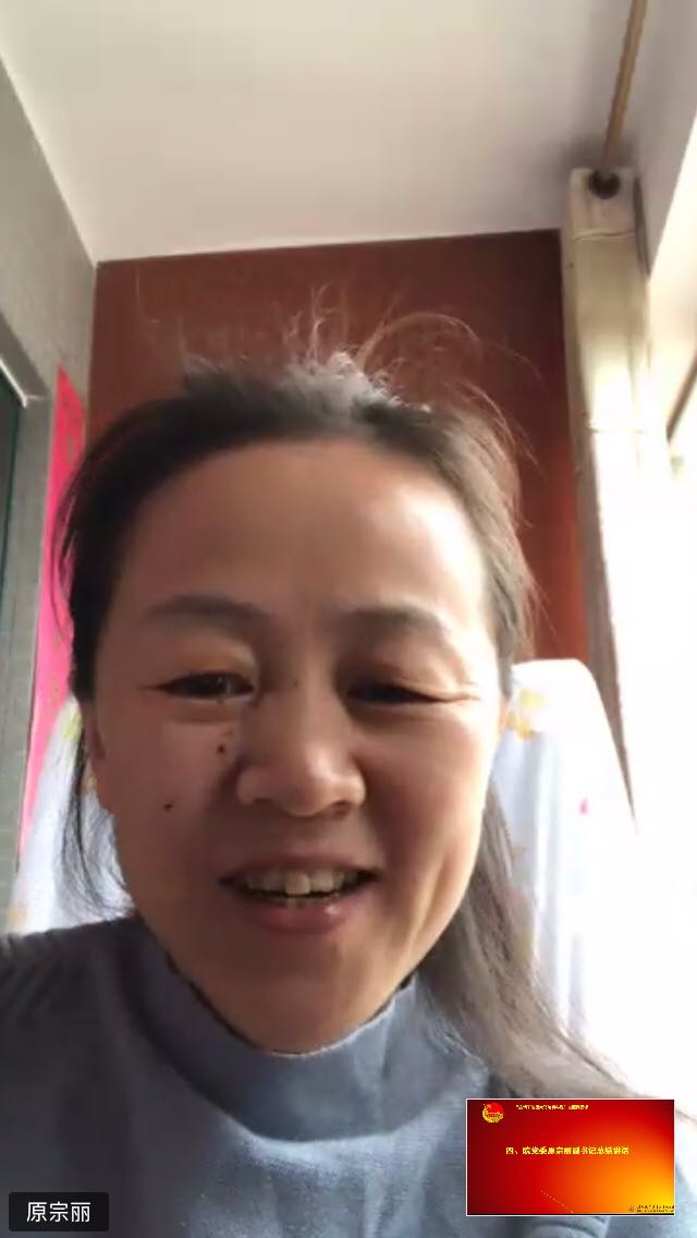 院党委原宗丽副书记总结讲话。她勉励同学们要学会三个关注。首先,作为一名青年大学生,我们要关注当前的疫情发展,不仅要关注国内疫情的动态,更要着眼国际社会。作为马院学子,我们必须要夯实专业基础,扎实理论功底,提升专业素质,用理论回应现实社会的发展所面临的问题;其次,要关注国家社会发展,此次疫情的爆发,让我们对“中国速度”、“中国力量”、“中国优势”都有了更加深刻的体会,我们要结合我们的专业特色,在思考为什么中国会取得如此成就的基础上,反思此次疫情暴发中所暴露出来的问题;最后,要学会关注反思我们自身,通过关注我们国家社会来透视我们每个青年人身上应该肩负的责任,在援助武汉的四万多医护人员中,有接近三分之一人的都是90后的青年一代。作为马院学子的我们,虽不能穿上战衣奔赴疫情一线,但我们可以立足本职,做好自己,遵守学校学院的相关规定,居家隔离有计划、有系统地坚持学习。老师提醒同学们,要善于调整心态,学会处理与家人关系,保护好自己与家人的健康。