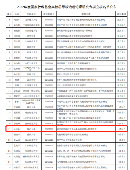 11月25日,全国哲学社会科学工作办公室公布了2022年度国家社科基金高校思想政治理论课研究专项立项名单,厦门大学党委副书记、马克思主义学院院长徐进功教授主持的《高校思想政治工作体系构建机理与路径研究》获立项资助。