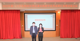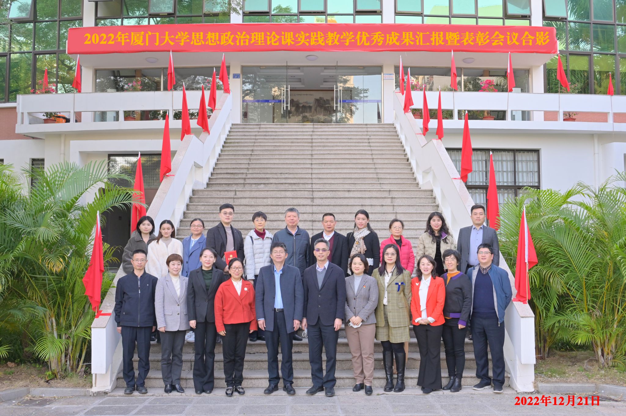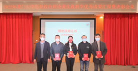 学生工作部副部长许美霞宣读《关于表彰2022年厦门大学思想政治理论课实践教学优秀成果、优秀指导教师的决定》。共196组成果报告获奖,其中一等奖19组,二等奖42组,三等奖63组以及优秀奖72组,傅丽芬等21名老师获得“优秀指导教师”荣誉称号。周大旺、徐进功为获奖师生颁发获奖证书并合影留念。