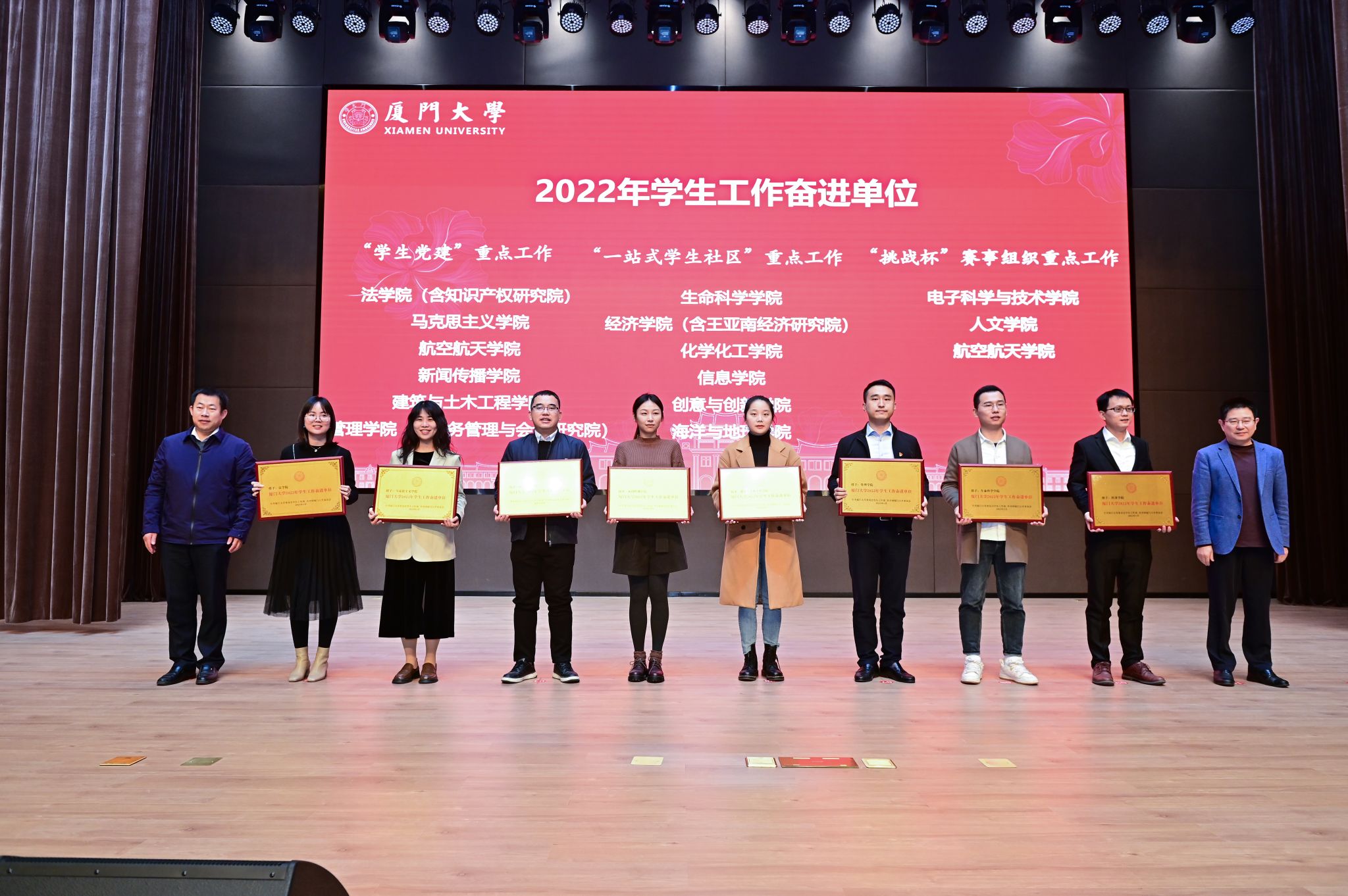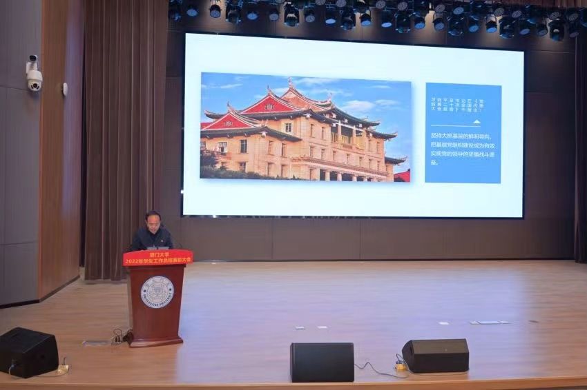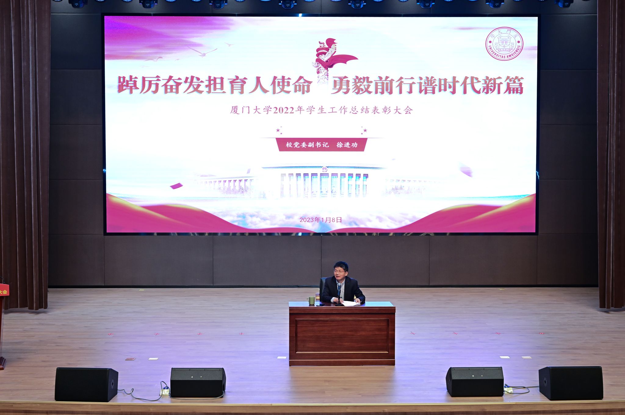 1月8日下午,厦门大学2022年学生工作总结表彰大会在翔安校区举行。校党委副书记徐进功出席会议并总结讲话,校党委常委、组织部部长、统战部部长孙理,各机关部门负责人出席会议。会议以线上线下同步方式。本次大会全面总结2022年我校学生工作的成绩及经验,并表彰年度学生工作先进单位、学生工作特色单位、学生工作奋进单位和年度优秀辅导员等。