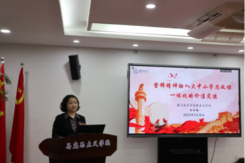 厦门二中副校长郑少群老师以《红色资源融入大中小学思政课一体化的实践路径》为题,从队伍建设一体化、育人目标一体化、资源整合一体化、教学形式一体化,四个一体化展开,详细论述了如何充分利用红色资源,传承红色基因,全面性、系统性、准确性地将红色文化一体化融入大中小学思政课,坚持整体性和突出重点相结合,体现理论联系实际,加强针对性和学理性。
