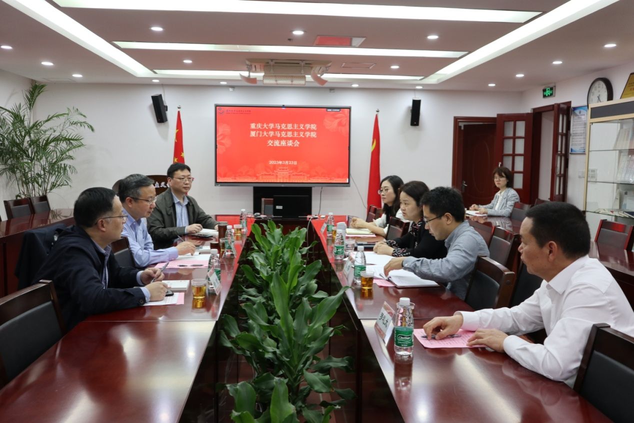 石红梅书记对重庆大学同行的到访表示欢迎。她向来宾详细介绍厦门大学马克思主义学院的历史沿革、发展现状等基本情况,并围绕我校“三位一体”思政课教学模式、师资队伍配齐建强等重点内容进行介绍。