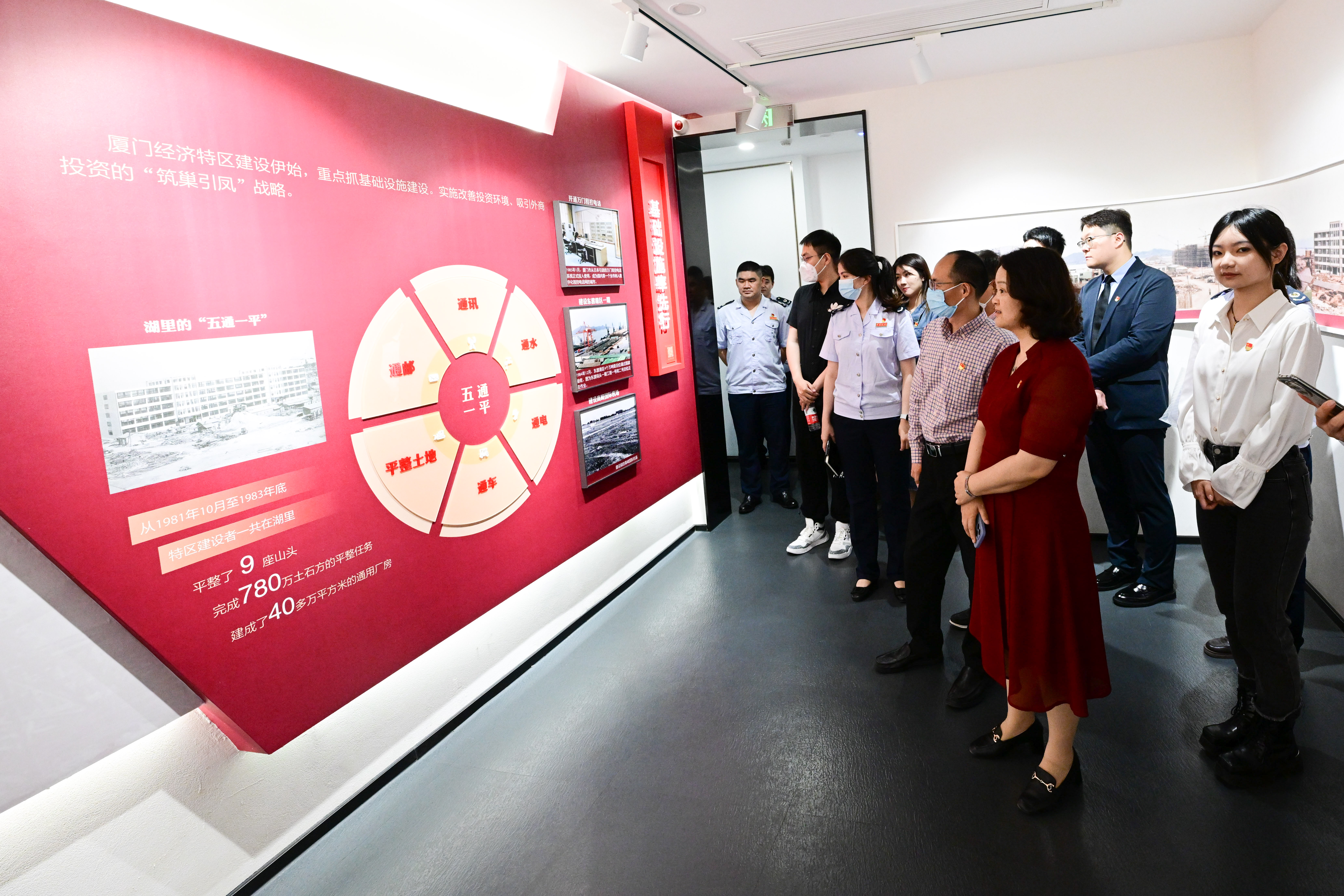 在活动的最后环节,与会师生和代表一同参观厦门经济特区纪念馆。一张张照片、一卷卷史料、一件件实物接续呈现在眼前,参观者的思绪被带回到八十年代那段敢闯敢拼的峥嵘岁月。四十多年来,在党中央的坚强领导下,厦门经济特区开拓创新、锐意进取,各项事业实现了历史性跨越,为改革开放和社会主义现代化建设做了重要贡献。厦门,寓意“大厦之门”,开放是这座城市与生俱来的基因。