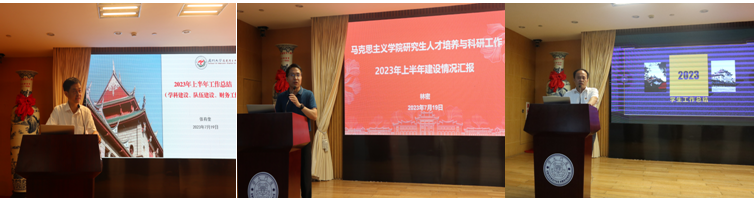 各分管领导就各自主管工作进行总结。张有奎常务副院长围绕学科建设、师资队伍建设、财务工作进行汇报。他指出,本学期学院扎实有序推进学科建设工作,结合主题教育,前往一流高校深入开展学科调研,查摆存在的问题,落实改进举措;引培并举,着力配齐建强师资队伍,全力保障思政课教师队伍建设;财务方面坚持量力而行,量入为出的指导方针,牢固树立“过紧日子”的思想,加强统筹,保证重点,厉行节约,勤俭办学。林密副院长就研究生人才培养和科研工作进行了汇报。他指出,学院稳步推进研究生人才培养工作,优化专题式课程建设,改革招生工作,完善制度保障,提升培养质量;科研工作方面,积极开展有组织的科研,搭建学术交流平台,加强基地管理,教师科研能力和科研影响力稳步提升。杨建中副书记对学生工作和干部培训工作进行了详细介绍。他围绕南强青马讲师团、团支部共建、社会实践、招聘和就业、毕业班工作等方面进行了汇报。他指出,本学期学院坚持以学生为中心,牢记立德树人根本目标,把学生工作和学科特色优势、专业能力训练紧密结合,育人成效显著;干部培训工作今年预计将有新突破。