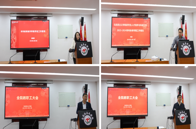 各分管领导就各自主管工作进行总结。原宗丽副院长围绕本科教育教学审核评估工作进行汇报。她强调,全体教职工要加强协同联动、全力以赴做好评估工作。林密副院长就研究生人才培养与科研工作进行了汇报。他指出,学院稳步推进研究生人才培养工作,优化研究生课程培养体系,加强学生培养过程管理;优化推免考核方式,提升生源质量;持续开展有组织的科研,搭建学术交流平台,创新学术交流模式,稳步提升教师科研能力和科研影响力。刘晓峰副书记对学生思政工作进行了汇报,并重点强调了学风建设工作。他提出,要以“亲师·问道”等活动为引领,努力开创学院学风建设新局面。张有奎常务副院长围绕学科建设、人事工作、财务工作进行汇报。他指出,本学期学院扎实有序推进学科建设工作,完善人才培养体系,成功获批本科专业申报和马克思主义理论博士后科研流动站申报,博士学位授权点专项核验顺利通过;人事方面,调整完善年度考核办法;财务方面,牢固树立“过紧日子”的思想,在加强全面统筹的基础上,厉行节约,勤俭办学。