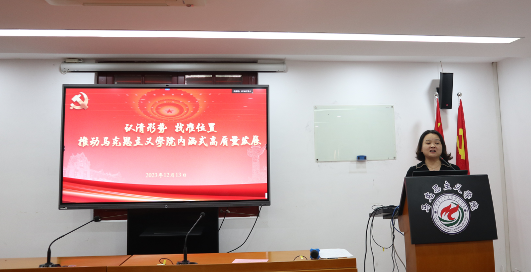 石红梅书记以“认清形势,找准位置,推动马克思主义学院内涵式高质量发展”为题进行了汇报,并对传达学习厦门大学全面从严治党工作会议暨警示教育大会有关精神提出了具体要求。她指出,学院要深入贯彻落实党中央全面从严治党的战略部署,切实把思想和行动统一到校党委决策部署上来;强化责任担当,推动全面从严治党各项工作落细落地;坚持久久为功,为一流大学建设营造风清气正的政治生态。
