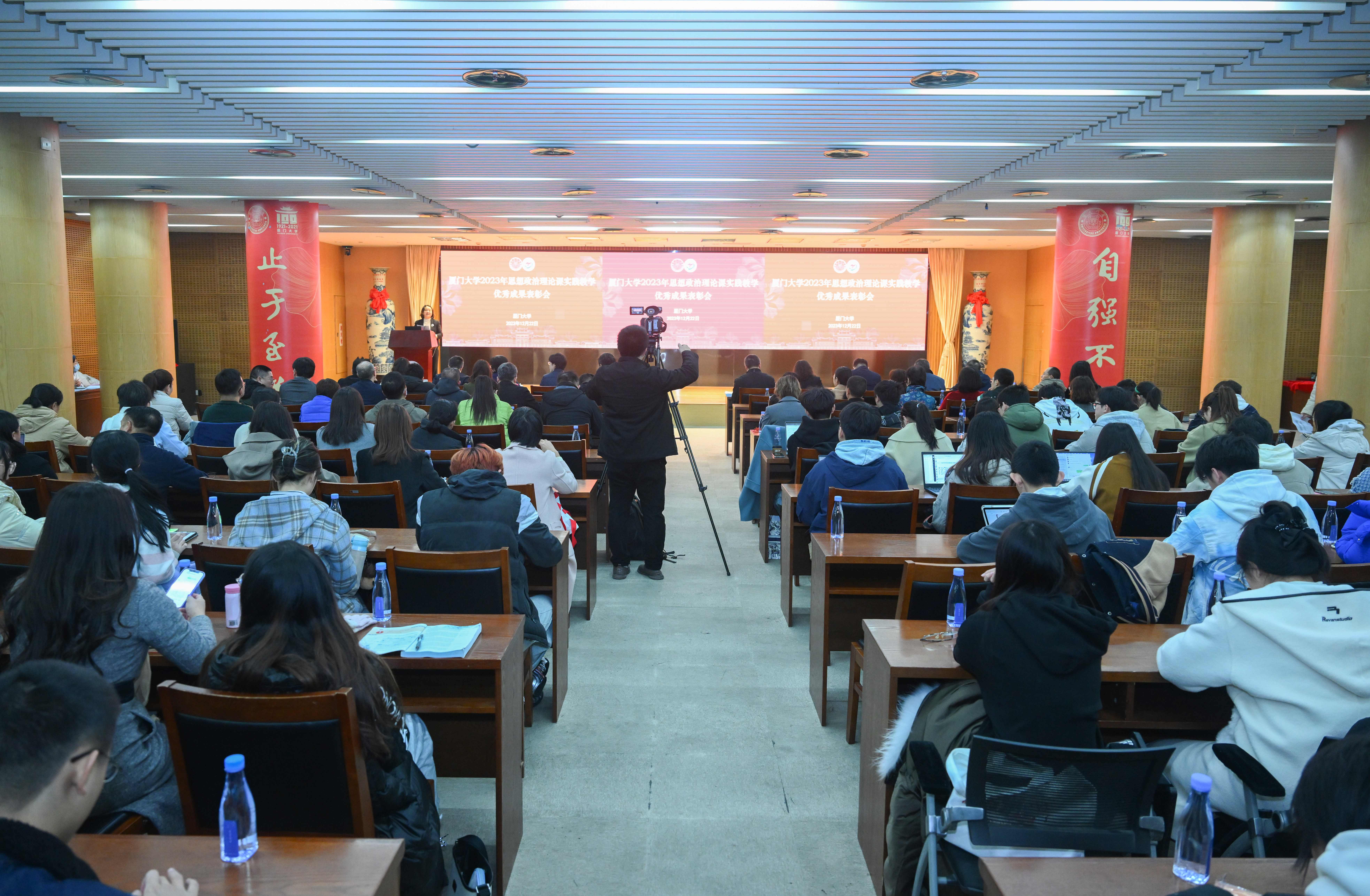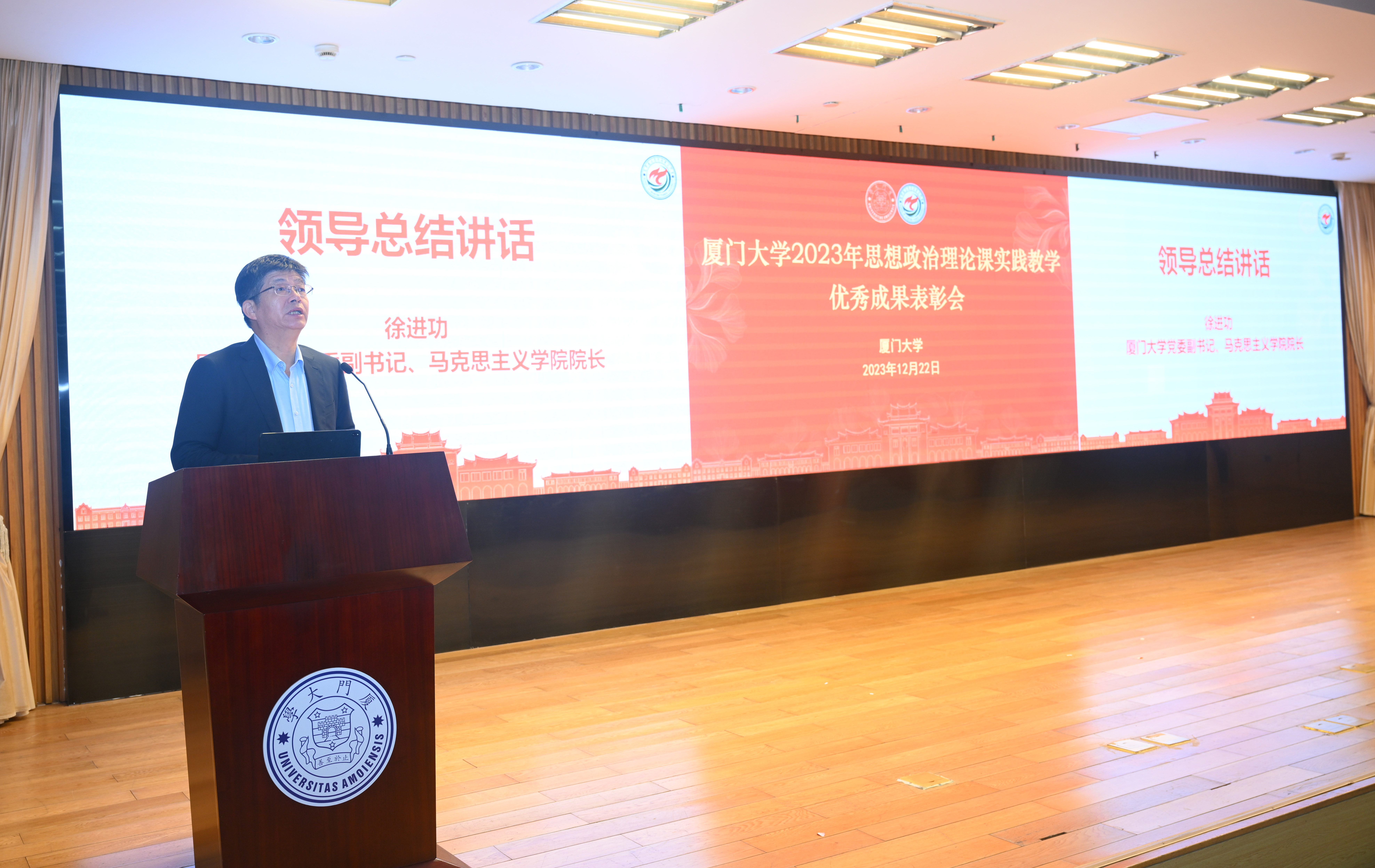 12月22日下午,厦门大学2023年思想政治理论课实践教学优秀成果表彰会在科学艺术中心一楼多功能厅召开。厦门大学党委副书记、马克思主义学院院长徐进功,副校长方颖,学校各部门负责人、各学院分管学生工作的党委副书记、学校思政课实践教学中心负责人及思政课教师、辅导员和学生代表等出席本次会议。会议由马克思主义学院党委书记石红梅主持。