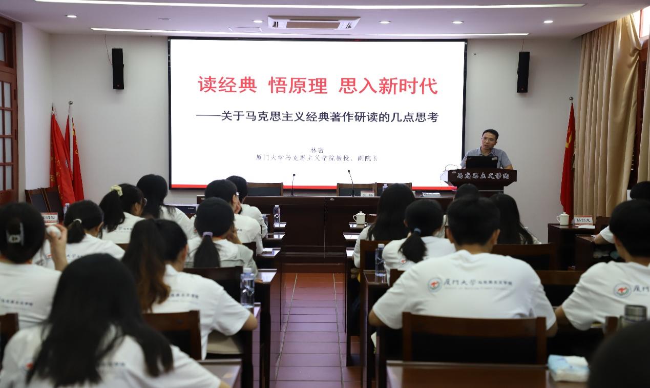 最后,副院长林密教授为参营学生讲授题为《读经典 悟原理 思入新时代》的专题课程。他通过列举不同时代马克思主义经典作家在《资本论》中汲取经验、智慧的例子,和现场师生共同探讨了置身于时代精神大逻辑中的阅读何以必要的问题。同时,他围绕”立足文本“”立足思想史“”立足时代“”洞见天地、众生、自我“几个方面,介绍了自己沿着由”术“到”道“感悟文本时代精神的经验。最后,他引用习近平总书记在纪念马克思诞辰200周年大会上的讲话,建议营员们从九个方面向马克思学习。林密教授内容丰富、立意高远的讲授获得现场师生的热烈反馈。