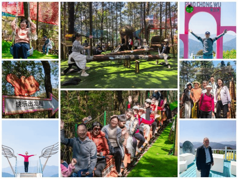 自由活动时间,教职工们纷纷打卡畲村特色景观:七星瓢虫小屋如童话散落林间,铁索桥摇荡山涧清风,孔雀翎雕塑与茶园青翠相映成趣。大家坐着小火车在竹林里穿行,于绿浪翻涌的山谷间纵情释放活力;驻足“七星瓢虫露营基地”,斑斓小屋点缀青山碧水,或拍照留念,或闲坐畅聊,感受山间慢时光的惬意悠然。