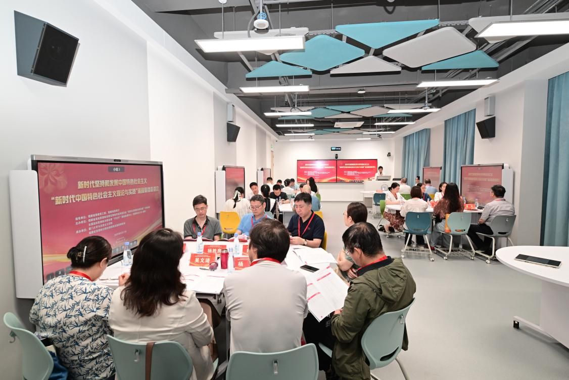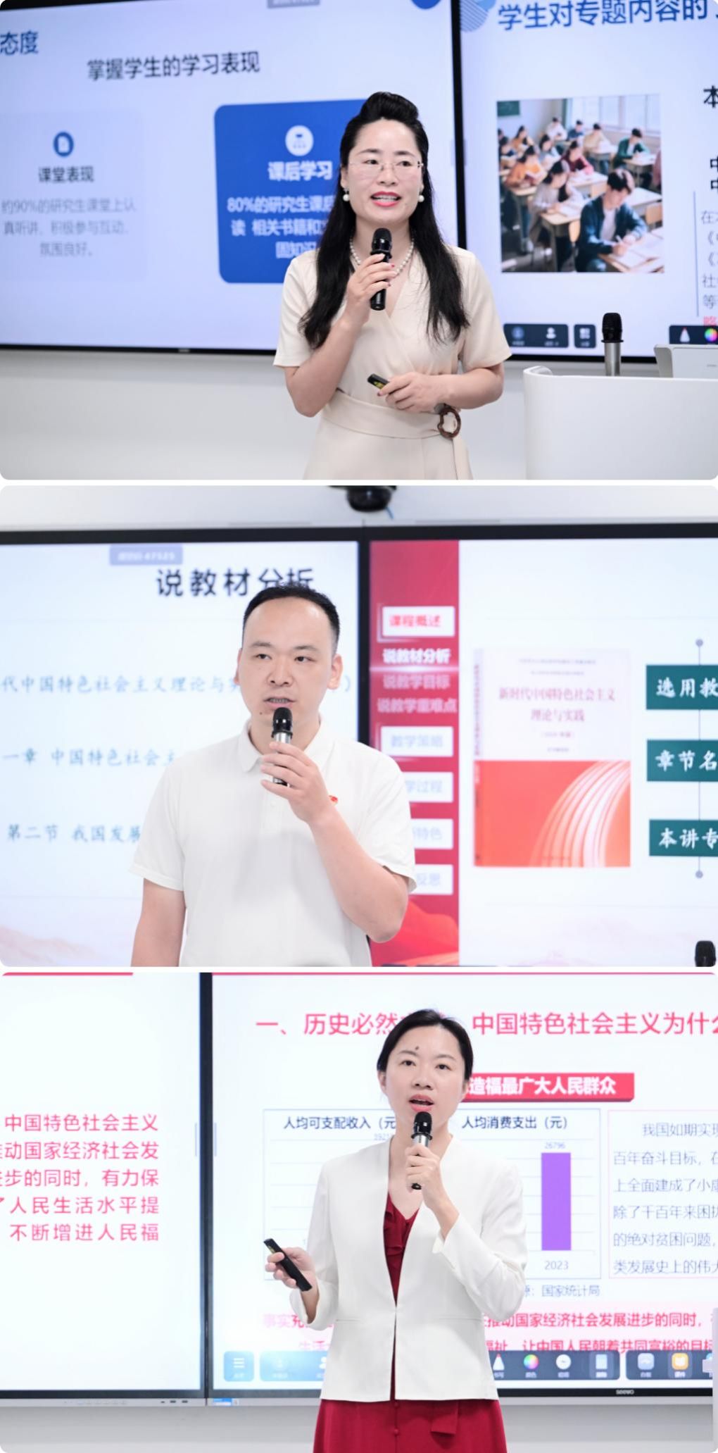 在说课展示环节,集美大学马克思主义学院讲师祁小平、闽南师范大学马克思主义学院副教授江晓晖、厦门理工学院马克思主义学院讲师廖文捷分别以“新时代新征程中国共产党的使命任务”、“我国发展新的历史方位”、“大道之行中国特色社会主义的实践密码”为主题,从教材分析、学情特点、教法设计、教学过程、教学反思等环节进行展示。