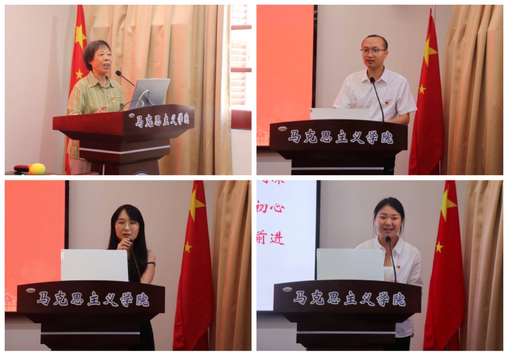 在“红心向党”入党初心故事讲述环节,何其颖、史勤、王仪、秦佳玉四位党员深情讲述了入党初心。党龄近50年的资深思政课教师何其颖追溯了她的红色成长轨迹,从少年时代受家庭熏陶对党组织萌生朴素向往,到学生时期在入队、入团、入党过程中经受严格考验,再到将为党育人、为国育才确立为毕生追求,深刻彰显了老一辈党员矢志不渝的初心和无私奉献的坚守。青年思政课教师史勤从亲历的重大历史事件讲起,这些使他深刻感受到中国共产党的强大领导力与国家发展的蓬勃伟力,他对党的真挚认同与强烈向往由此生发出来,并不断延展为立德树人的实际行动。2021级博士研究生党员王仪回顾了她在学院学习成长的历程,她通过参与基层理论宣讲、服务群众等实践活动,更加坚定了传播马克思主义真理、服务党和国家发展大局的信念与决心。2022级硕士研究生第二党支部书记秦佳玉结合自身的从军经历,分享了在军营中锤炼出的忠诚信念与家国情怀。这段特殊经历使她深刻理解了“到党和人民最需要的地方去”的深刻含义,也坚定了她毕业后选择奔赴四川、投身西部基层建设的决心。四位优秀党员代表的真挚分享,深深感染了在场的每一位同志,唤起了大家的初心记忆。