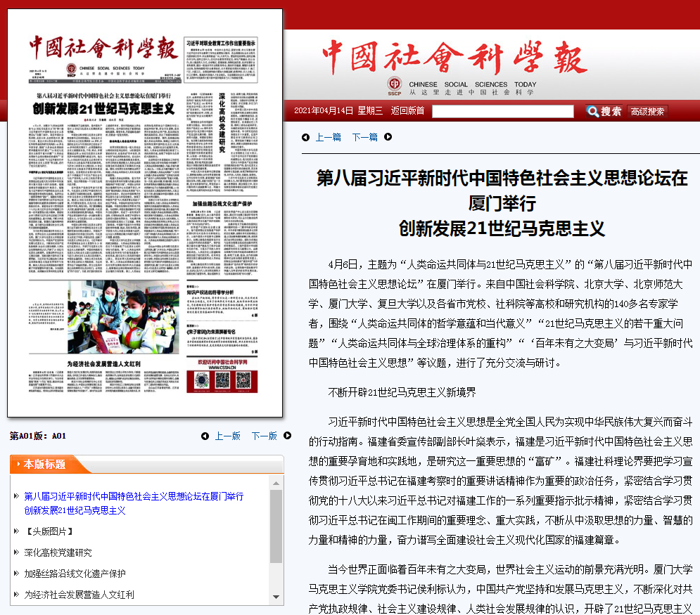 2021年4月14日,《中国社会科学报》头版头条报道我院在4月6日厦大百年校庆期间举办的主题为“人类命运共同体与21世纪马克思主义”的“第八届习近平新时代中国特色社会主义思想论坛”。