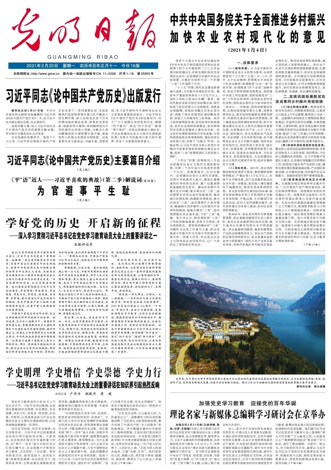 2月22日,《光明日报》刊发报道《学史明理 学史增信 学史崇德 学史力行——习近平总书记在党史学习教育动员大会上的重要讲话在知识界引起热烈反响》,文章引用了我校党委副书记、马克思主义学院院长徐进功的发言。徐进功表示,厦大师生将牢记初心使命、坚定信仰信念,积极开展党史学习教育,把革命精神内化于心、外化于行,转化为干事创业、勇担使命的强大精神动力。