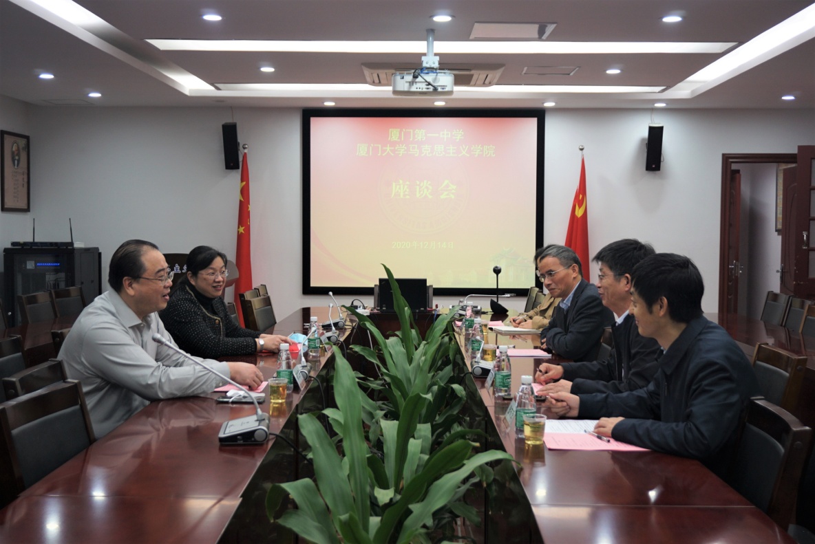 12月14日下午,厦门第一中学党委书记、校长陈文强,副校长谢凯灵一行专程前来我院就双方开展合作事宜进行座谈交流。厦门大学党委常委、宣传部部长、马克思主义学院院长徐进功,院党委书记侯利标,常务副院长张有奎等共同接待了客人并参加了座谈。