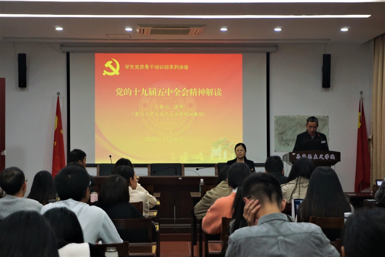 为引领学生党员深入学习贯彻党的十九届五中全会精神,2020年12月4日晚,学院在囊萤楼216会议室开展了以“十九届五中全会精神解读报告”为主题的学习讲座。讲座邀请马克思主义学院袁华副教授作主讲。讲座由学院党委书记侯利标主持,学生党员骨干及硕博新生党员参加学习。
