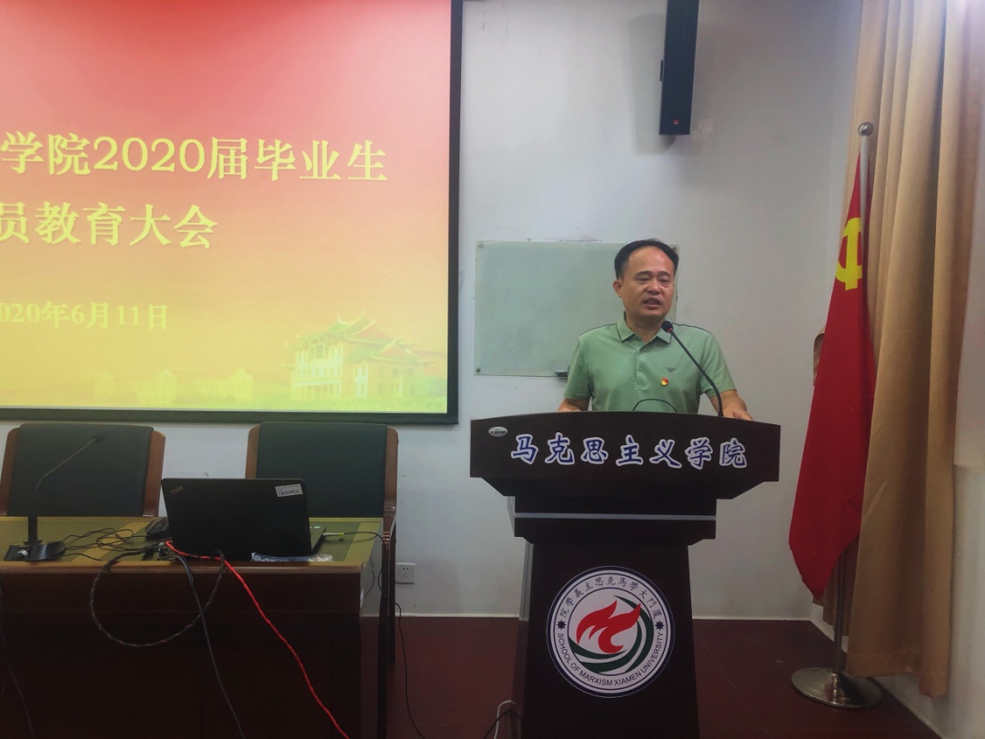 最后,学院党委副书记杨建中老师嘱咐毕业生党员:一是要始终牢记自己的党员身份,强化党员意识,严格要求自己,对党忠诚,勇于担当作为;同时,要记住自己是一名厦大学子,要关心母校发展,维护母校声誉,传播厦大文化。二是既要仰望星空,又要脚踏实地,保持正确的人生方向和认真严谨的积极态度,要吃的了苦,沉得住气,在成功和挫折的锤炼中成长。三是要懂得感恩,感恩老师的教导,感恩父母的培育,感恩的朋友陪伴。最后他祝福毕业生党员同志们在新的舞台上大展身手,工作顺利,鹏程万里。